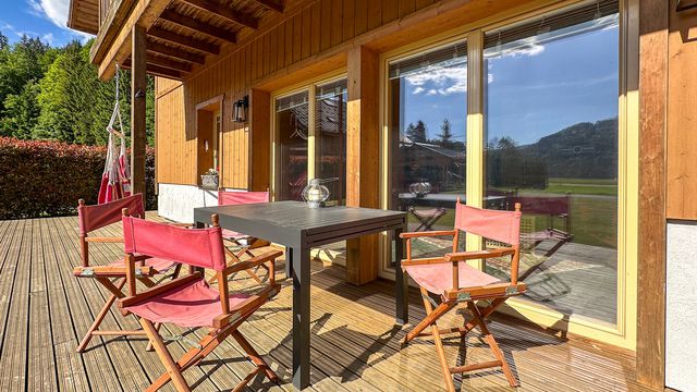 At the front, an expansive garden overlooks open fields, while the rear of the chalet backs onto the forest.