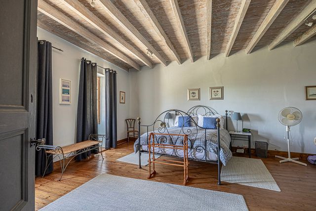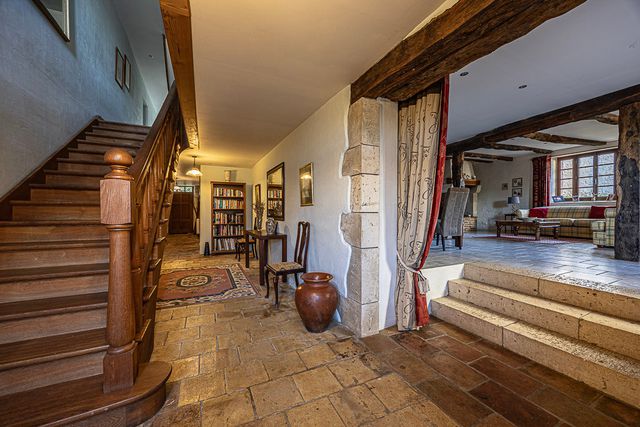 High ceilings, original fireplaces, beams and tomette floors blend effortlessly with modern comfort including double glazing and oil-fired central heating (electric heating in the gîte). Light floods the expansive reception rooms, creating exceptional volumes and an atmosphere of refined country elegance.