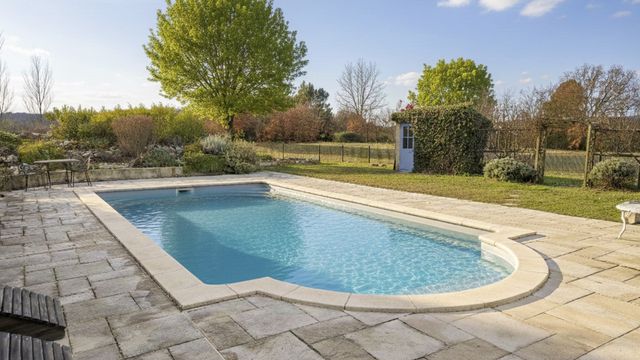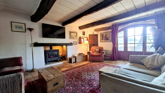 A42248GWI83 - Idyllic stone farmhouse with blue shutters. This beautiful house is full the of the charm and character of a bygone era. The property benefits from a light filled sunroom leading to the swimming pool, spacious lounge with wood burning stove, farmhouse dining / kitchen fully equipped, bedroom, office and 2 bathrooms on the ground floor and 2 bedrooms both en-suite on the first floor. The land of 3 acres surrounding the property is flat and ideal for horses or other animals, growing lavender, olive trees or perhaps a little vineyard.