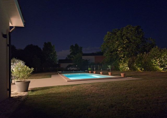 À l'extérieur, jardin paysagé sans vis-à-vis, terrasse plein sud en béton brut, patio intimiste et espace piscine composent un cadre de vie rare. Au calme absolu à seulement 5 mn des commerces, écoles et commodités.