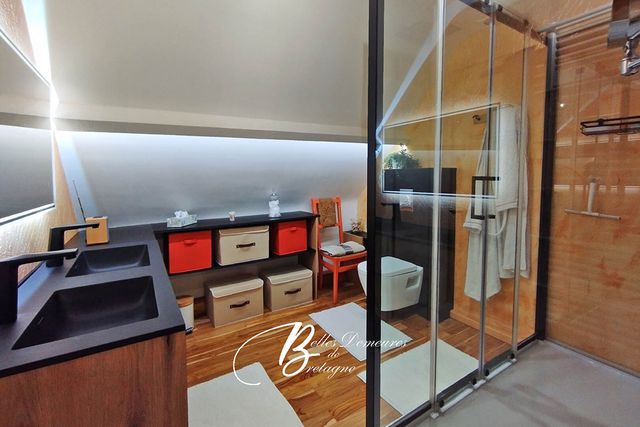 Édifiée en 1801, cette bâtisse est l'une des plus longues du Morbihan. Entièrement rénovée avec des matériaux de qualité et en parfait état, elle se divise en trois habitations modulables selon les besoins.