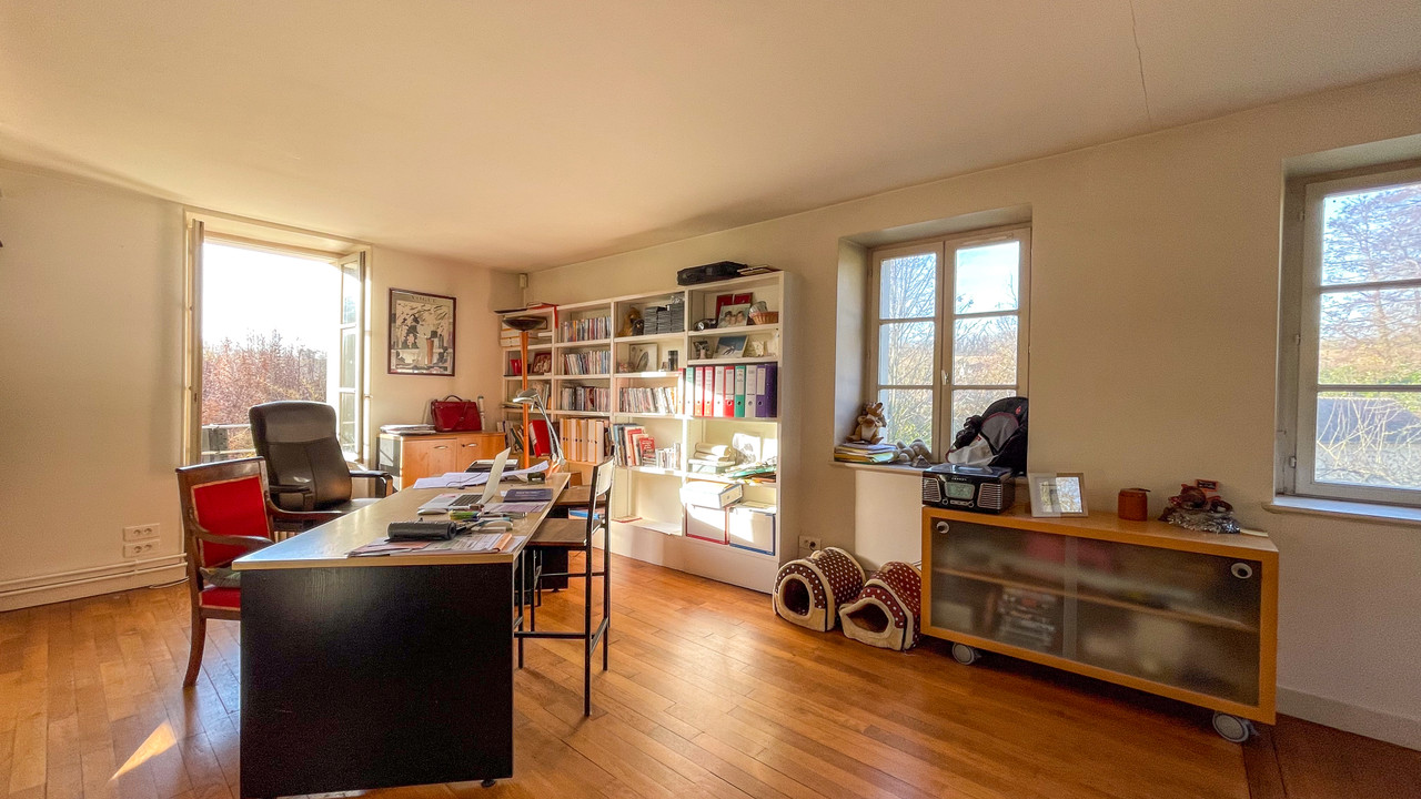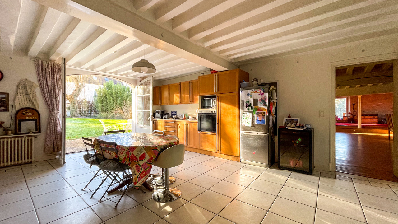 A43240EHO95 - À Labbeville près de L'Isle-Adam, cet ancien moulin datant de 1870 offre un lien unique entre le passé et le présent. Le vaste intérieur présente des colonnes en pierre d'origine et des poutres en bois massif. La Sausseron traverse le jardin et alimentait autrefois une turbine hydraulique qui pourrait être réinstallée pour produire de l'électricité. Le bâtiment a été récemment équipé de pompes à chaleur à haut rendement, d'une climatisation réversible et d'un chauffe-eau thermodynamique.