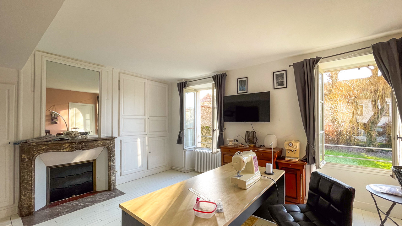 A l'extérieur : Dépendance avec grand garage, jardins avec arbres fruitiers et pelouses bordés d'un côté par la rivière, de l'autre par le château.