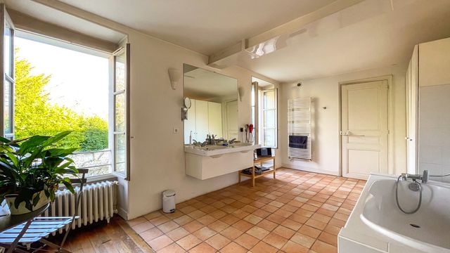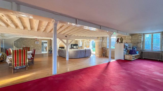 A43240EHO95 - À Labbeville près de L'Isle-Adam, cet ancien moulin datant de 1870 offre un lien unique entre le passé et le présent. Le vaste intérieur présente des colonnes en pierre d'origine et des poutres en bois massif. La Sausseron traverse le jardin et alimentait autrefois une turbine hydraulique qui pourrait être réinstallée pour produire de l'électricité. Le bâtiment a été récemment équipé de pompes à chaleur à haut rendement, d'une climatisation réversible et d'un chauffe-eau thermodynamique.
