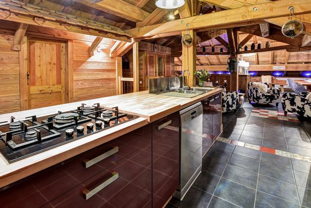 Son design épuré et moderne, associé aux poutres apparentes et au bois brossé, lui confère une ambiance alpine chaleureuse.