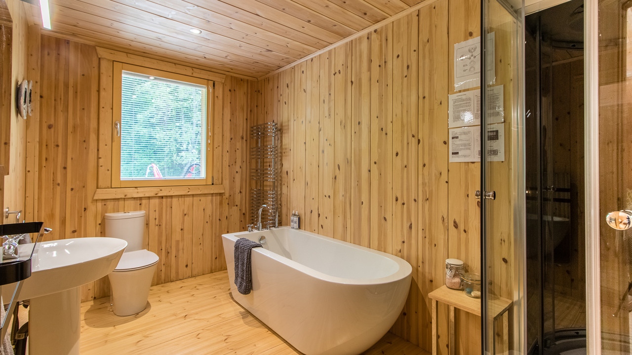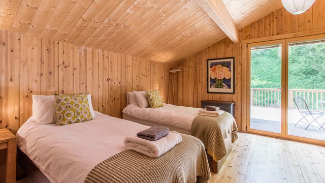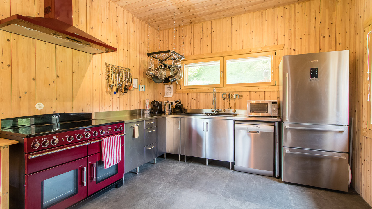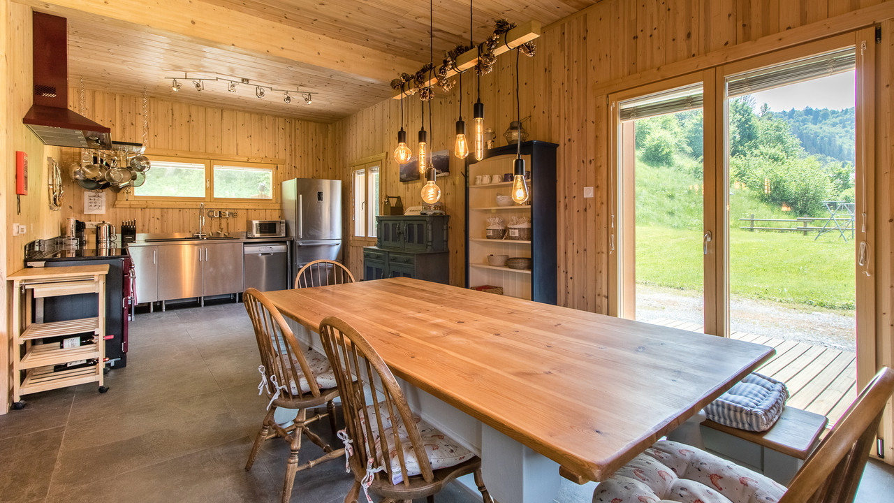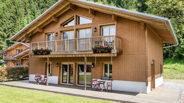 À l'avant, un grand jardin donne sur des champs ouverts, tandis qu'à l'arrière, le chalet est adossé à la forêt.