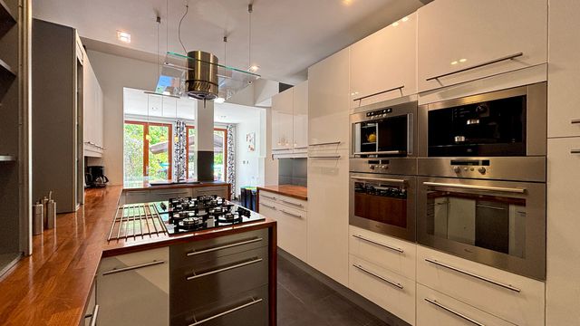 Espaces communs : grande salle de réception, cuisine, salle à manger, salle de sport.