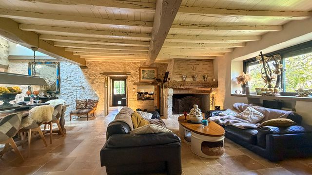 Les extérieurs comprennent des jardins paysagers faciles d'entretien, une grange couverte de 75 m² et une piscine 10 x 5 m avec vue sur la vallée. Une maison d'amis rénovée (2 chambres) complète l'ensemble.