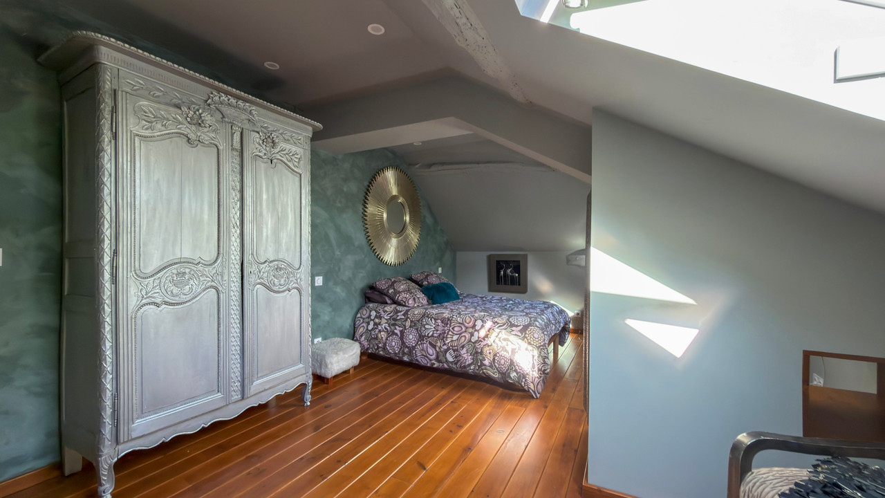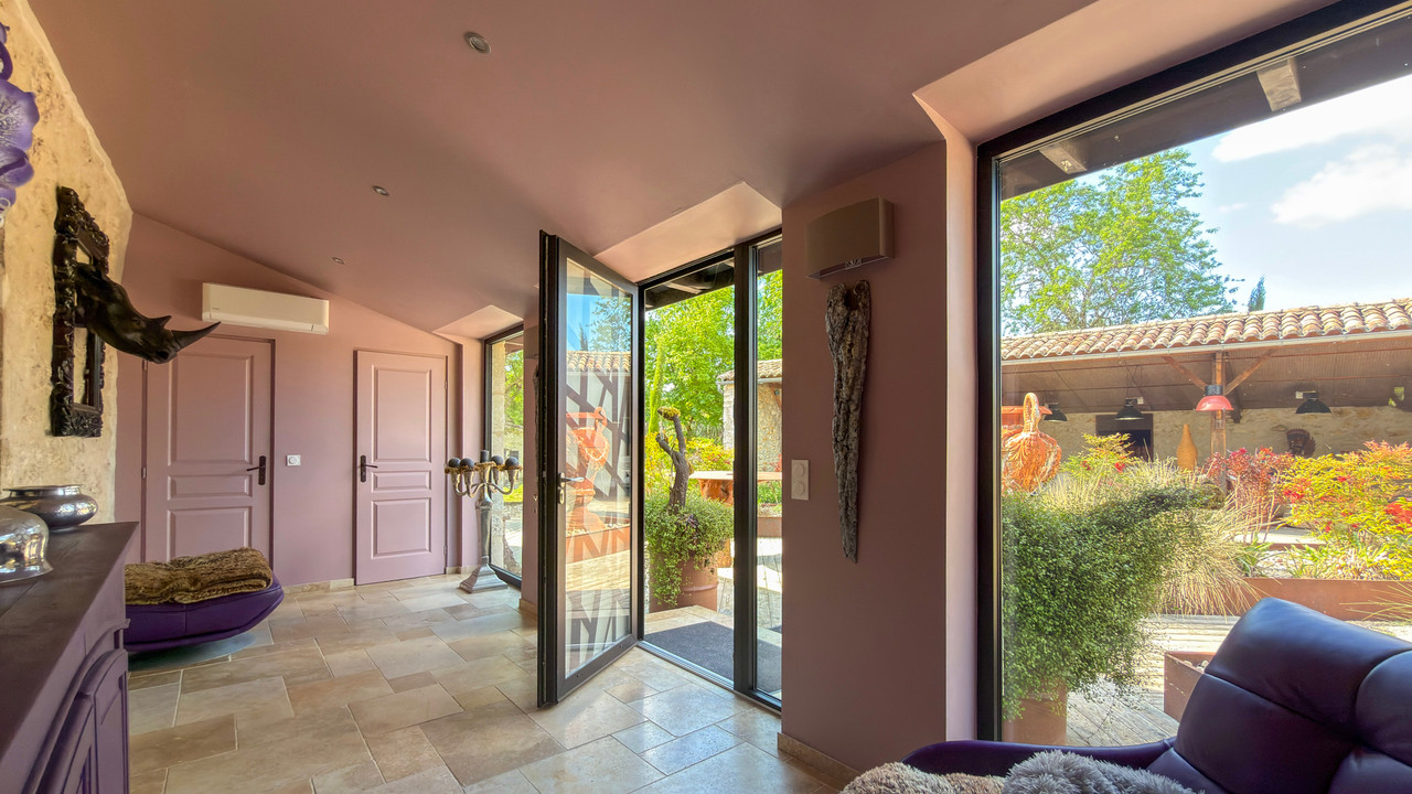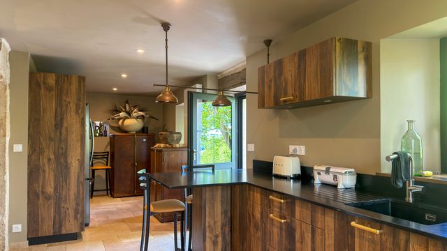 La maison principale (env. 200 m²) est lumineuse, avec de beaux espaces de vie ouverts avec cheminée, une cuisine de qualité donnant sur les terrasses, 4 chambres, un bureau et une cave à vin.