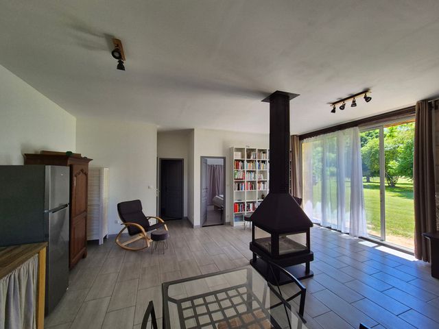 1 grand séjour lumineux avec cuisine équipée et poêle à bois