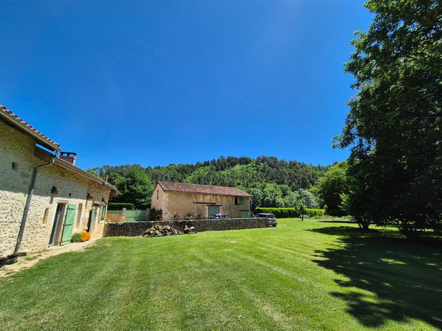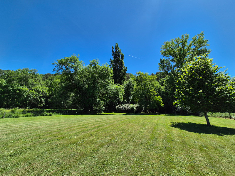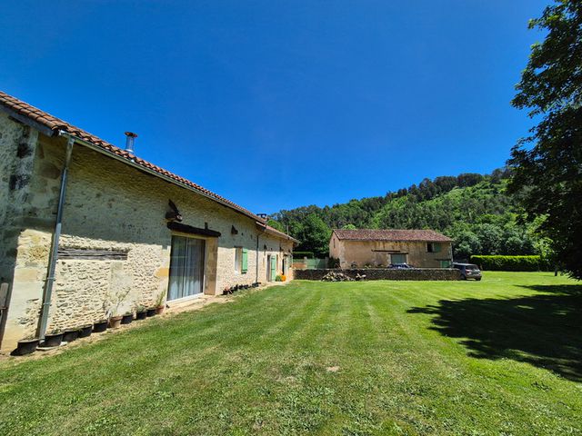 Longère de 185 m² + grange de 100 m² comprenant 3 logements sur un terrain plat et entièrement clos de 6 500 m² + accès privé à la rivière.