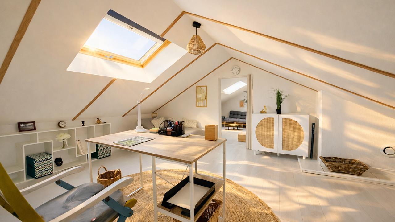 Le dernier étage révèle un studio lumineux avec bureau, chambre et salon, idéal pour travailler ou se détendre