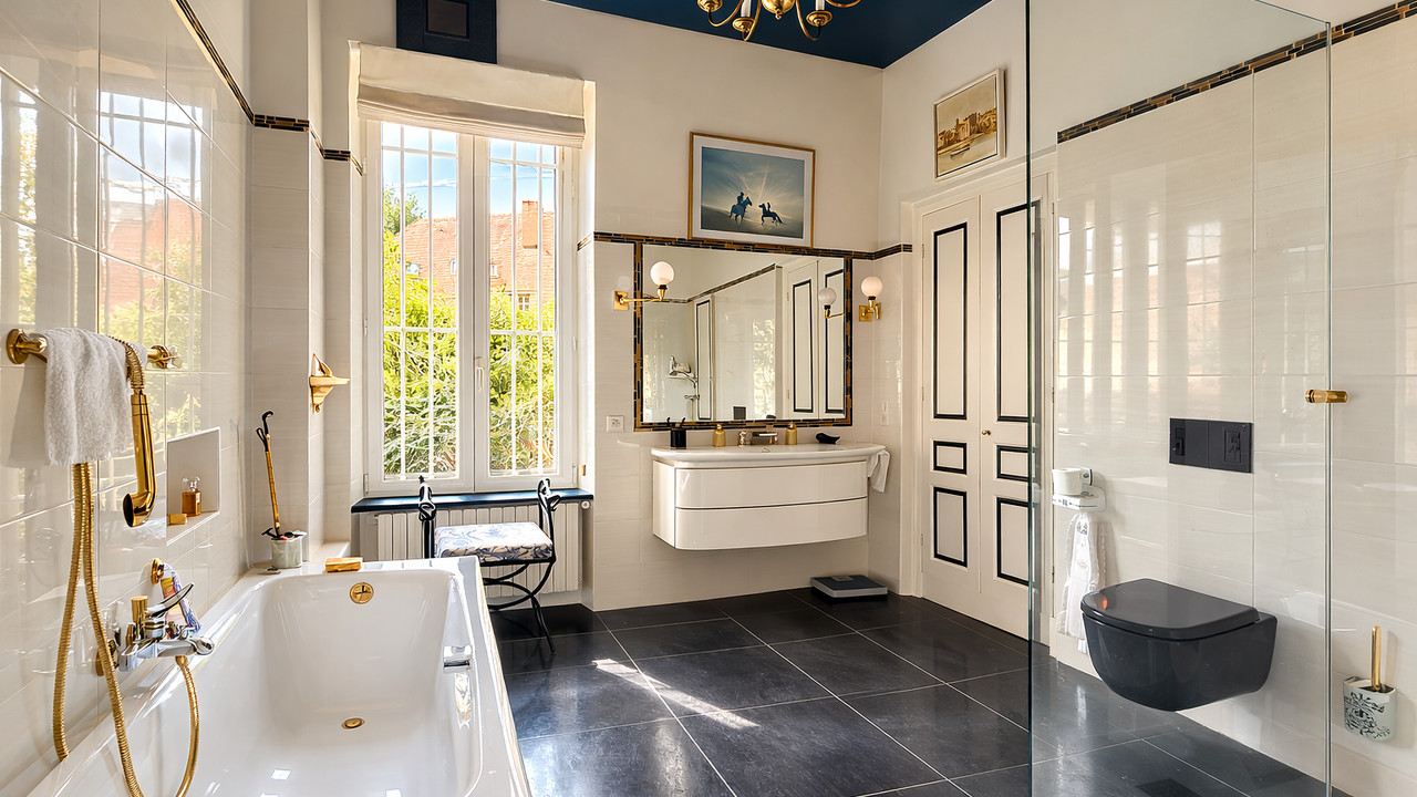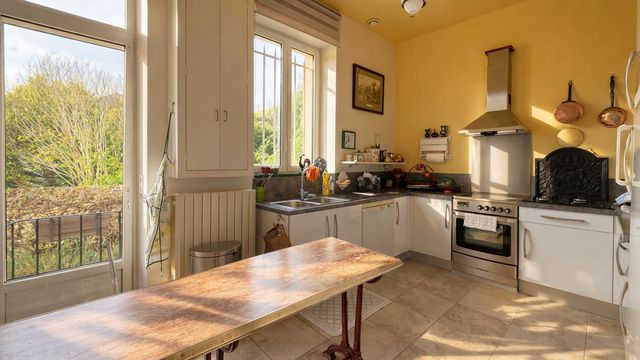 Le rez-de-chaussée s'ouvre sur une vaste entrée avec un magnifique escalier en bois massif. Au premier étage côté jardin : cuisine équipée, lumineux double séjour ouvrant sur la terrasse et le jardin, grande chambre avec salle d'eau, vaste bureau pouvant servir de salle à manger ou chambre, et une salle de bain indépendante