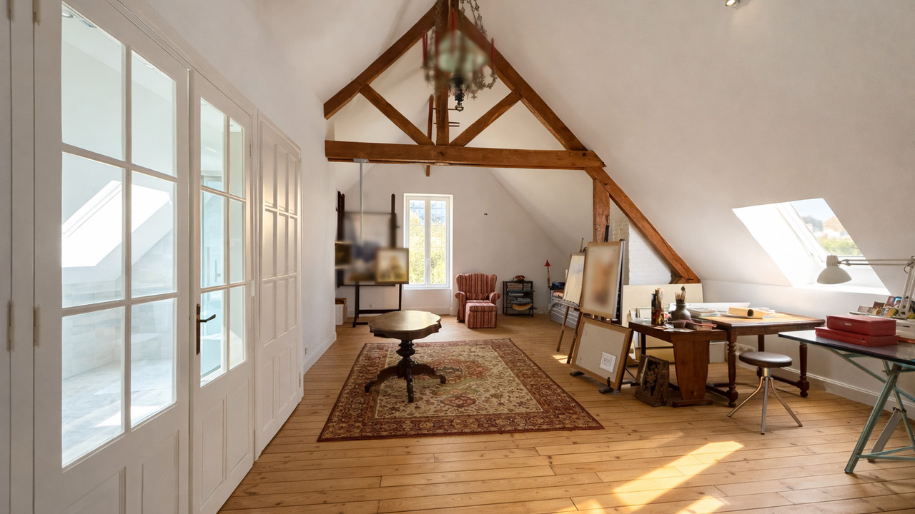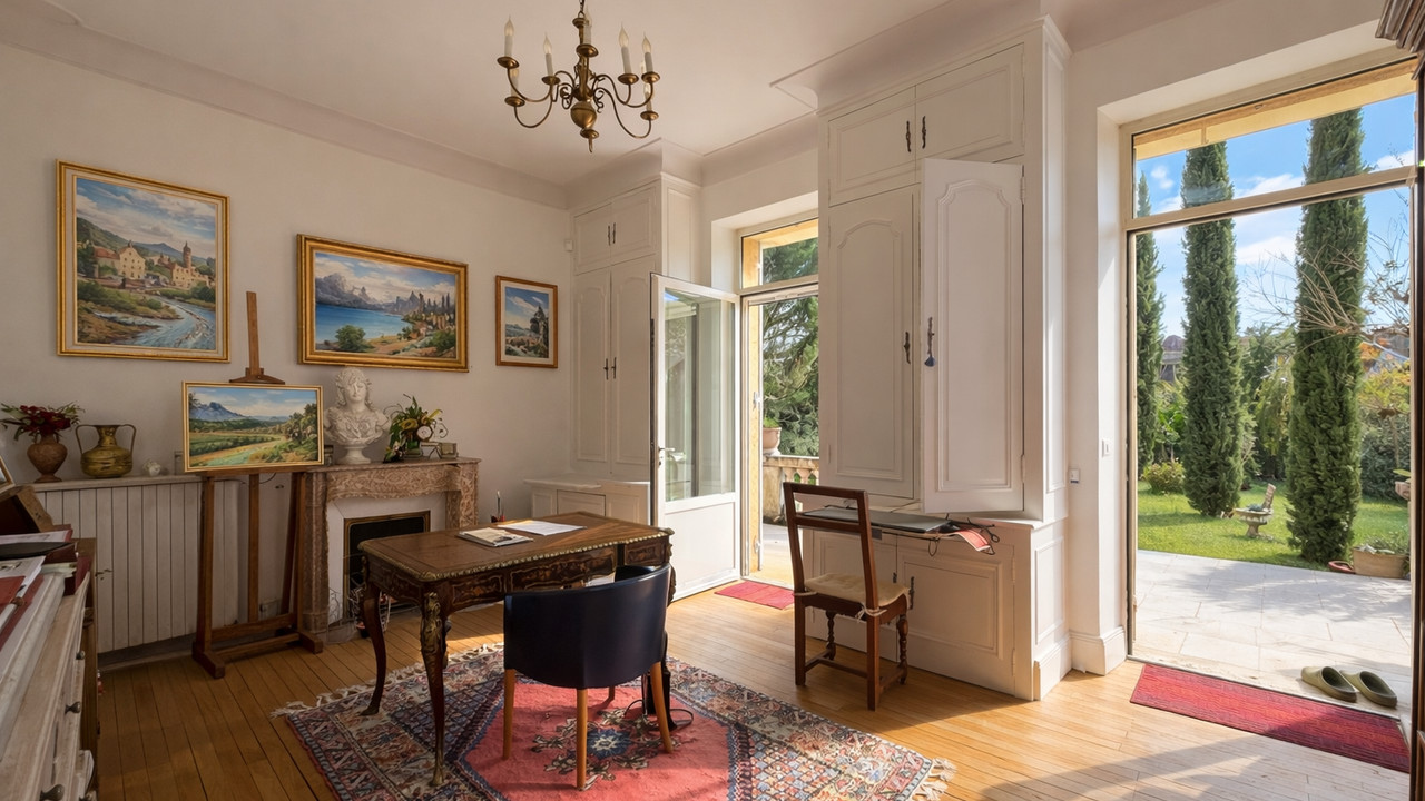 Le deuxième étage comprend un spacieux studio ou chambre, une chambre supplémentaire et une salle de bain. Buanderie, cave et deux garages complètent ce bien rare et prestigieux, idéal en résidence principale ou secondaire