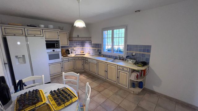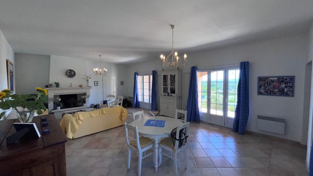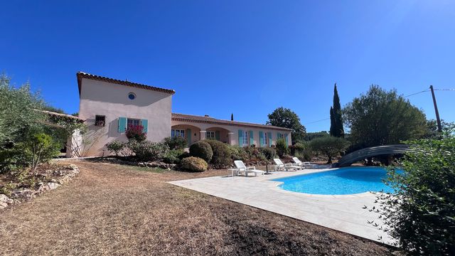 A40346GWI83 - Magnifique villa à Cotignac. Cette charmante propriété provençale, située dans un environnement calme et sans vis-à-vis, à proximité du village et de tous les commerces, repose sur un terrain de 4 240 m² agrémenté de 80 oliviers et de diverses plantes méditerranéennes. Offrant une intimité et un calme absolus, elle bénéficie d'une vue panoramique exceptionnelle sur la campagne environnante. Le jardin abrite une belle piscine. Un grand garage de 27 m² et un abri-voiture sont également disponibles. Au rez-de-chaussée : un hall d'entrée, des toilettes invités, un grand séjour-salle à manger de 45 m² avec cheminée. Cette pièce lumineuse donne accès à une terrasse ombragée, orientée plein sud, offrant une vue imprenable sur la piscine et les environs. Une cuisine spacieuse et entièrement équipée avec coin repas, un cellier/buanderie, une suite parentale avec salle de bains et toilettes, trois chambres supplémentaires, un dressing, une salle de douche et des toilettes séparées.
