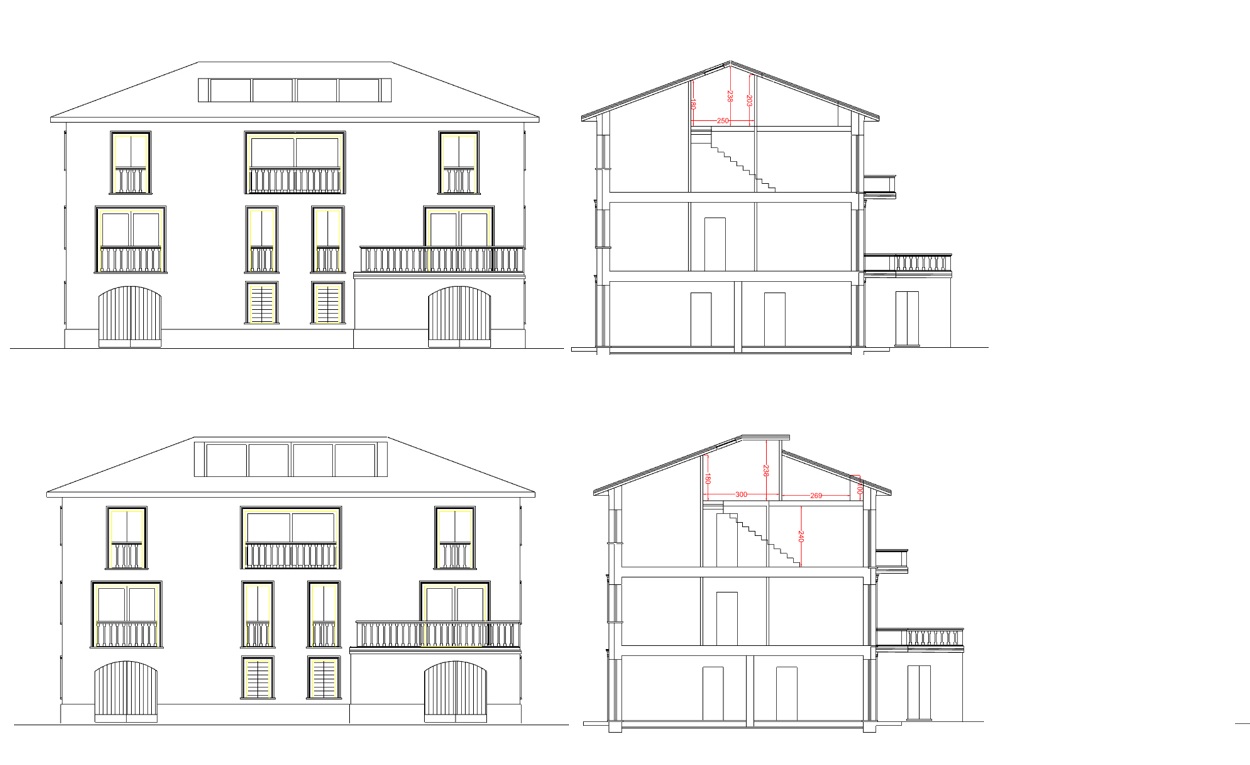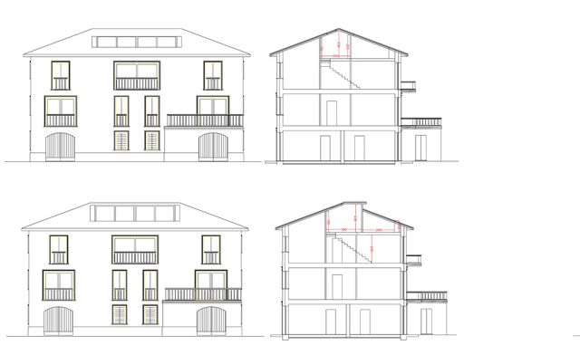 La maison, d'une surface habitable de 590 m² répartie sur trois niveaux, a fait l'objet d'une rénovation. Elle comprend quatre appartements pouvant être transformés en deux logements de 180 m² chacun (un au premier étage et un au deuxième). Un garage ou un sous-sol est prévu au rez-de-chaussée.