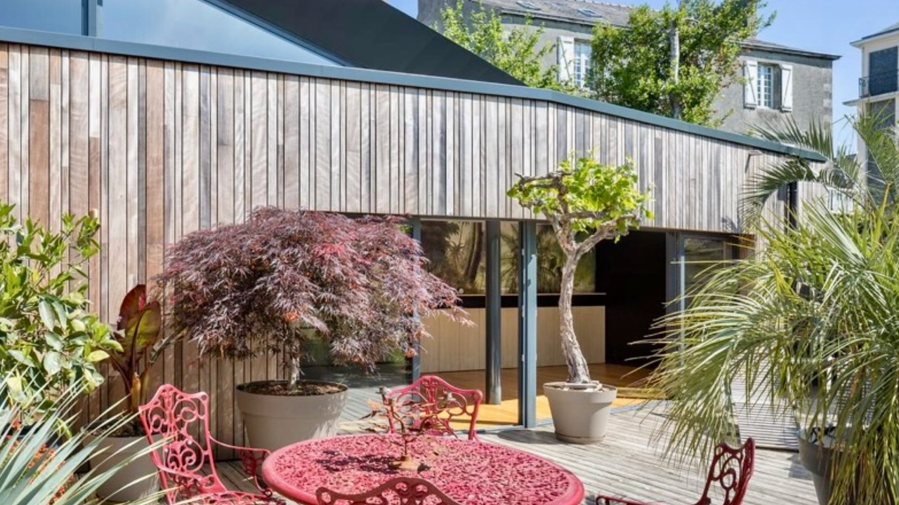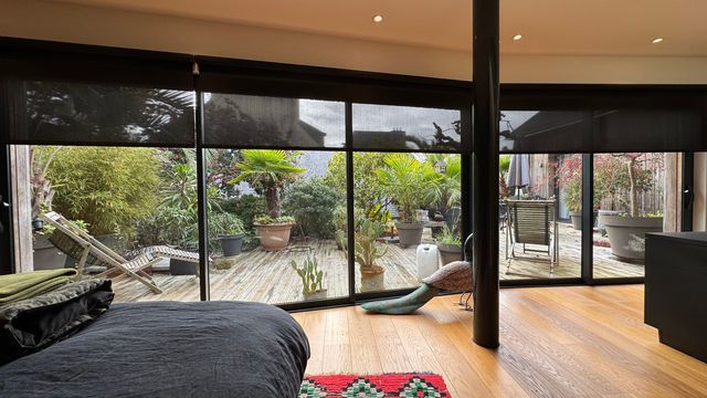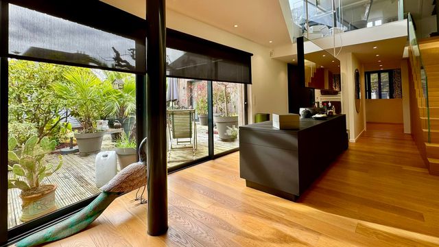 Cette remarquable maison de ville en pierre a été entièrement repensée et transformée, avec une extension sculpturale en ossature bois de 46 m², une lumineuse suite parentale avec salle de bains design, un bureau en mezzanine et une belle terrasse préservée des regards.