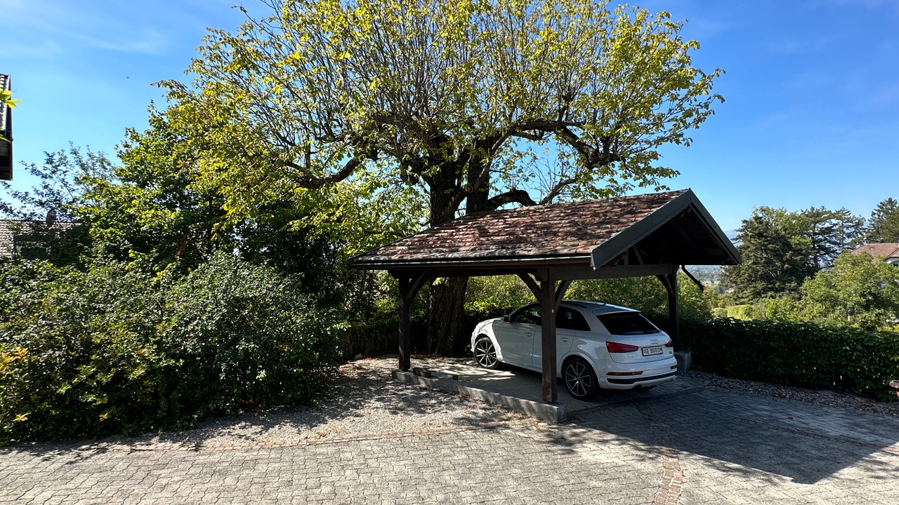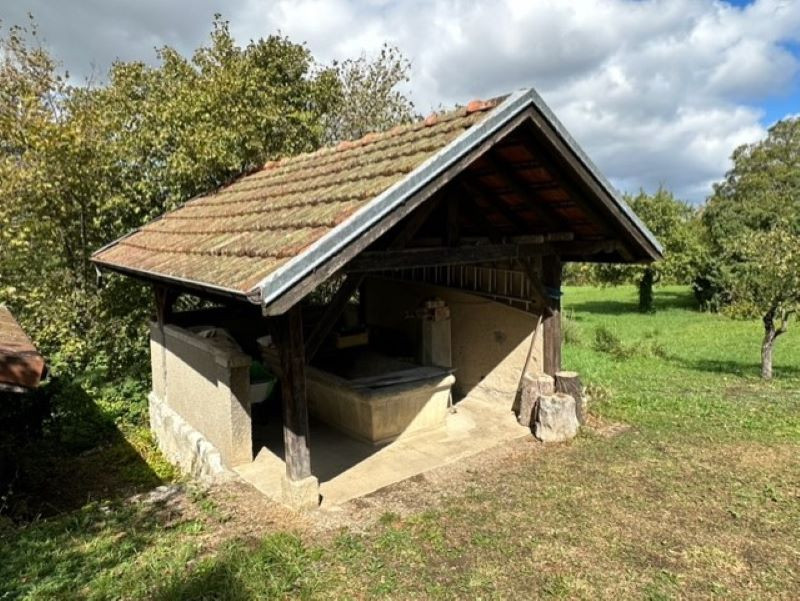 Superbe jardin de 1359 m² avec petit lavoir en pierre, abri pour deux voitures.