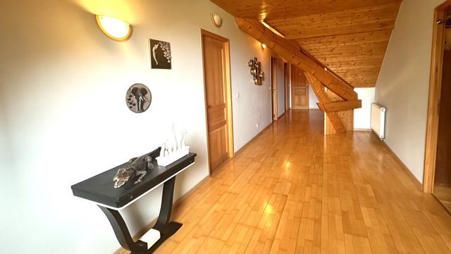 Au RdC, il y a une entrée accueillante, une cuisine bien équipée menant à un grand espace salon - salle à manger avec un insert à bois, un WC et une suite parentale. Au premier étage, on trouve une salle de bains familiale avec WC, quatre chambres, dont trois avec accès au balcon, une deuxième suite parentale et une chambre avec dressing attenant. Une buanderie et une chaufferie se trouvent dans le sous sol, ainsi que trois grandes pièces, dont deux avec une fenêtre, offrant encore plus d'espace exploitable.