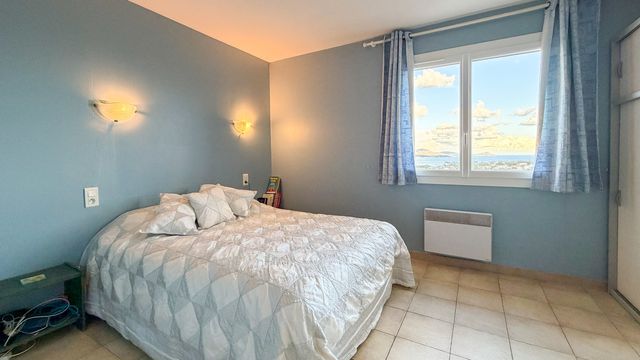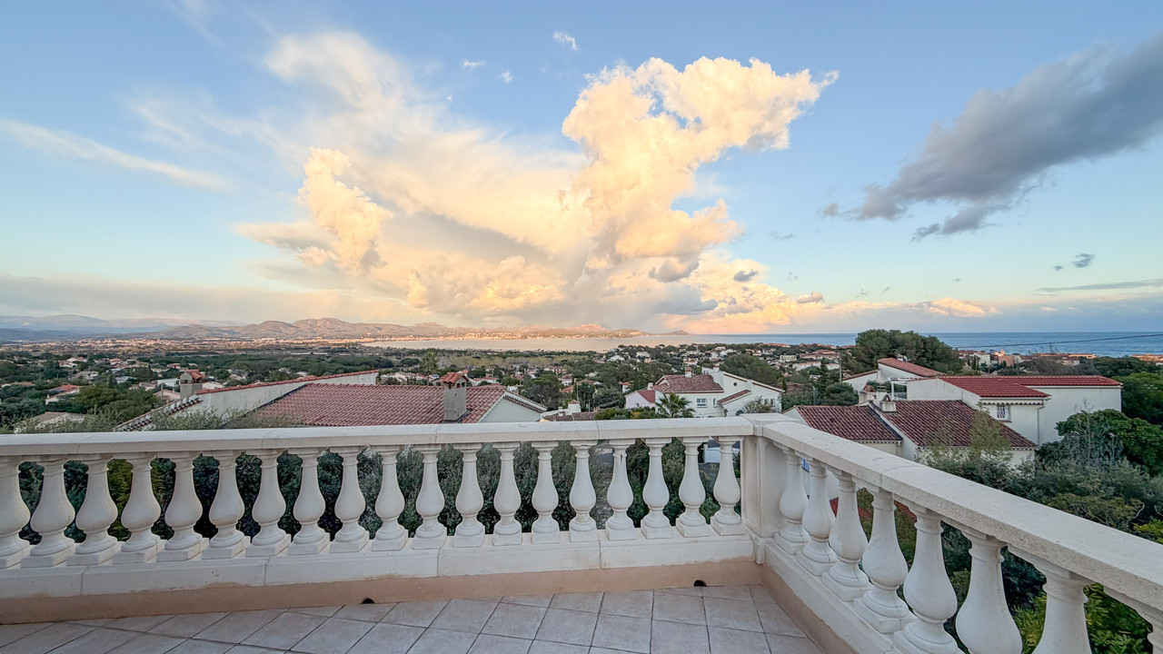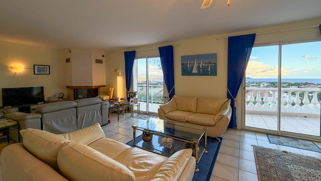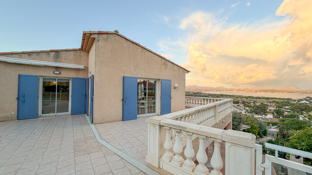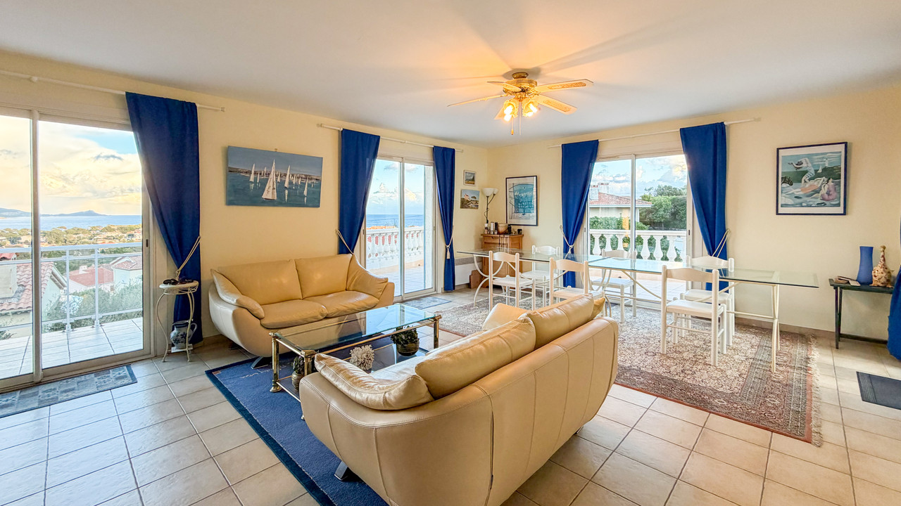 A41463JTO83 - Spacieuse villa avec vue sur la mer à Fréjus, avec un salon lumineux et une terrasse panoramique donnant sur la Méditerranée et les montagnes environnantes. Le niveau principal comprend un grand salon avec cheminée, une cuisine avec portes donnant sur la terrasse et la piscine, 4 chambres doubles et deux salles d'eau. Le rez-de-jardin comprend un appartement d'amis de 3 chambres avec accès indépendant, 2 salles de bains, un salon, une buanderie et le garage. Située sur un terrain de 1 110 m² facile d'entretien avec piscine et terrasses, la propriété comprend la climatisation, des panneaux solaires, un tout-à-l'égout et se trouve à seulement 5 minutes en voiture des plages locales.