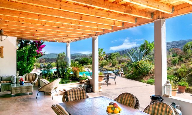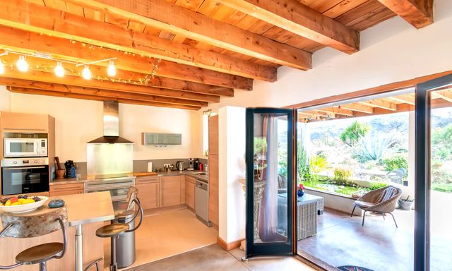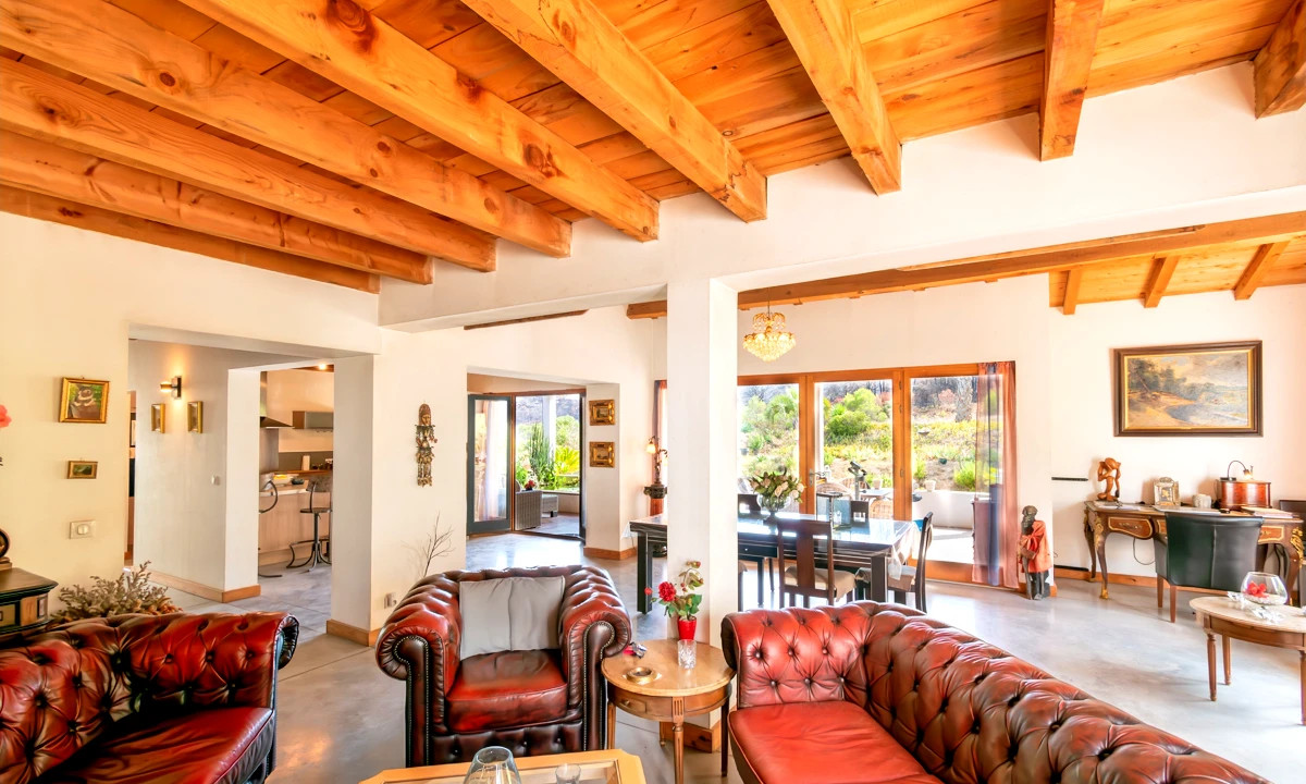 Une terrasse couverte de 60 m² permet de profiter de la douceur du climat toute l'année. S'ajoutent un garage double de 100 m², buanderie, dressings, sauna, poêle à bois et à granulés, eau de source filtrée et fosse septique certifiée.