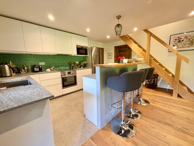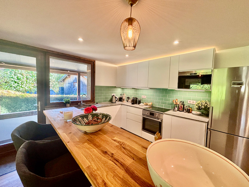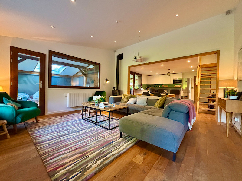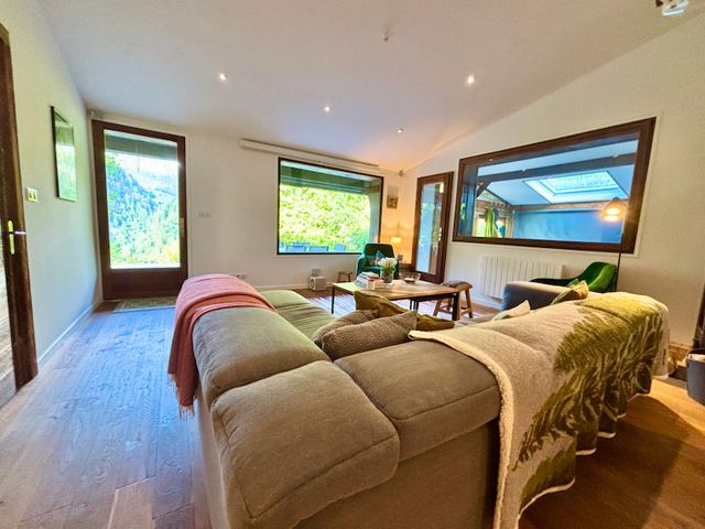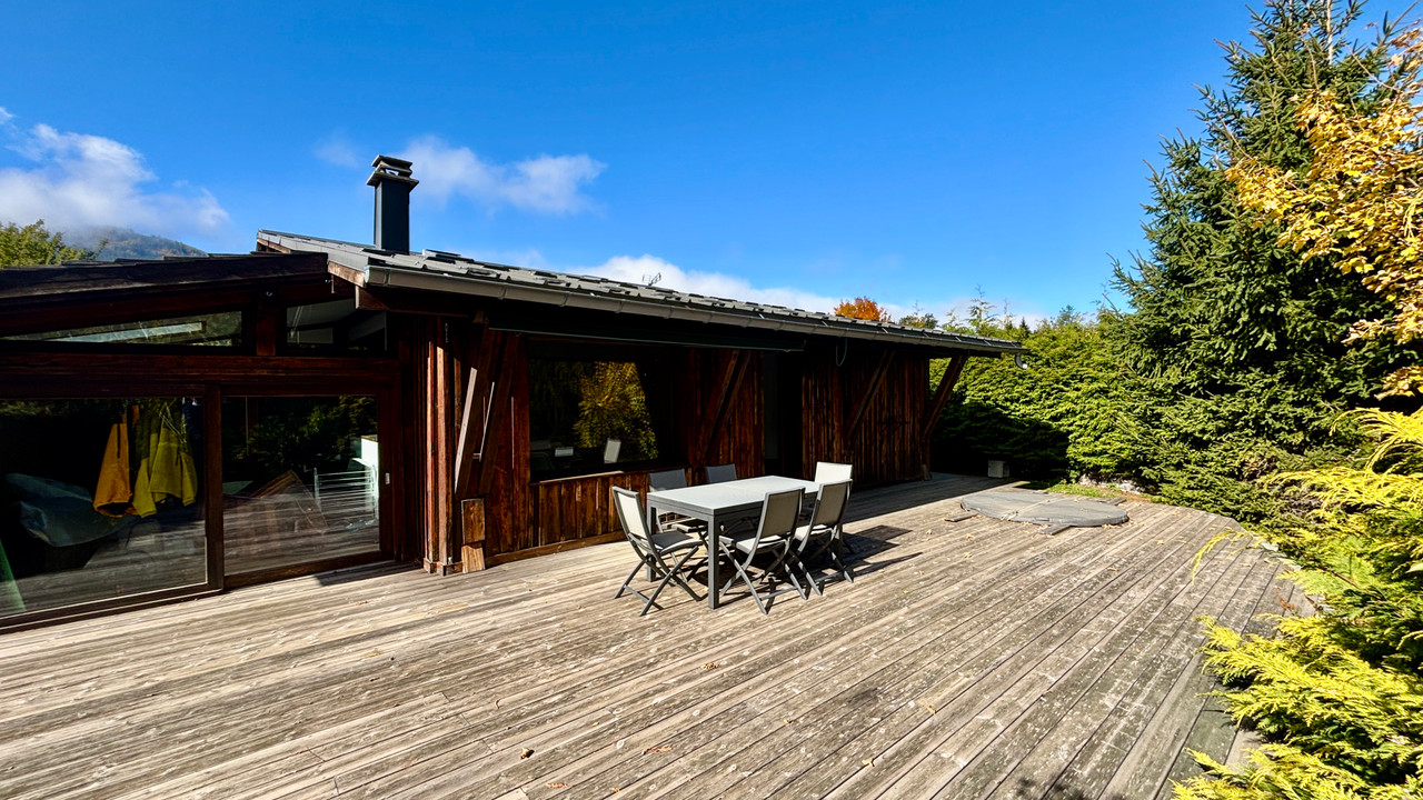 With a large open plan living space with great views towards Mont Blanc , including a lounge with wood burning stove, dining area and fully equipped kitchen. A conservatory and a huge sunny terrace ready for a hot tub - with uninterrupted views towards Mont Blanc and the refuges on the Aiguille du Gouter and to the Aiguille du Midi in Chamonix.