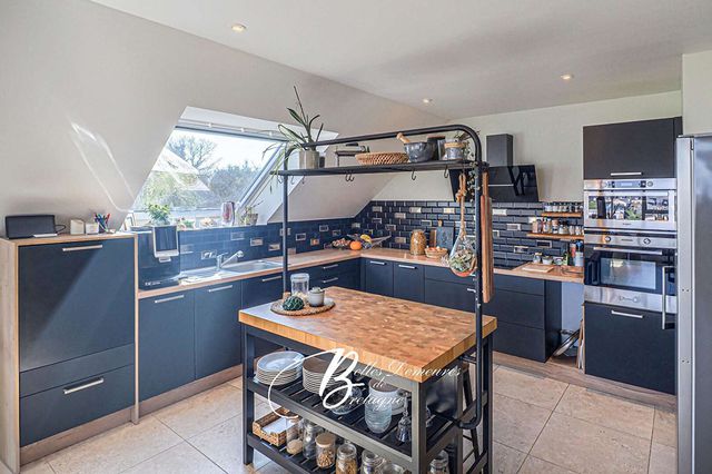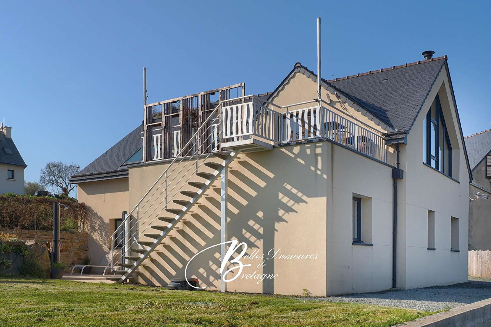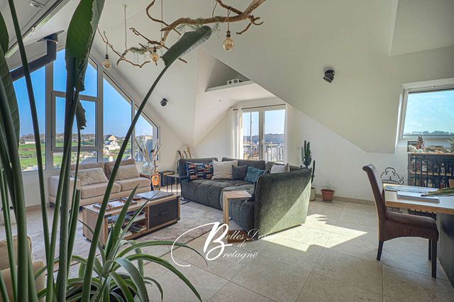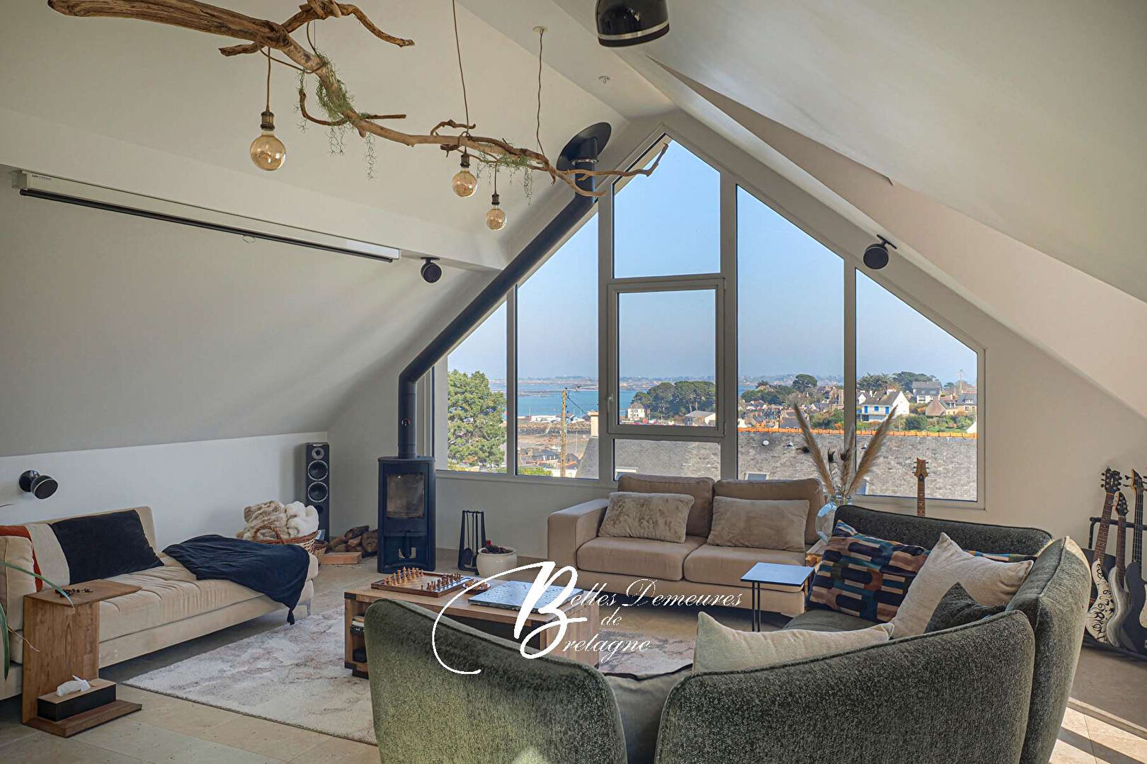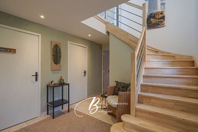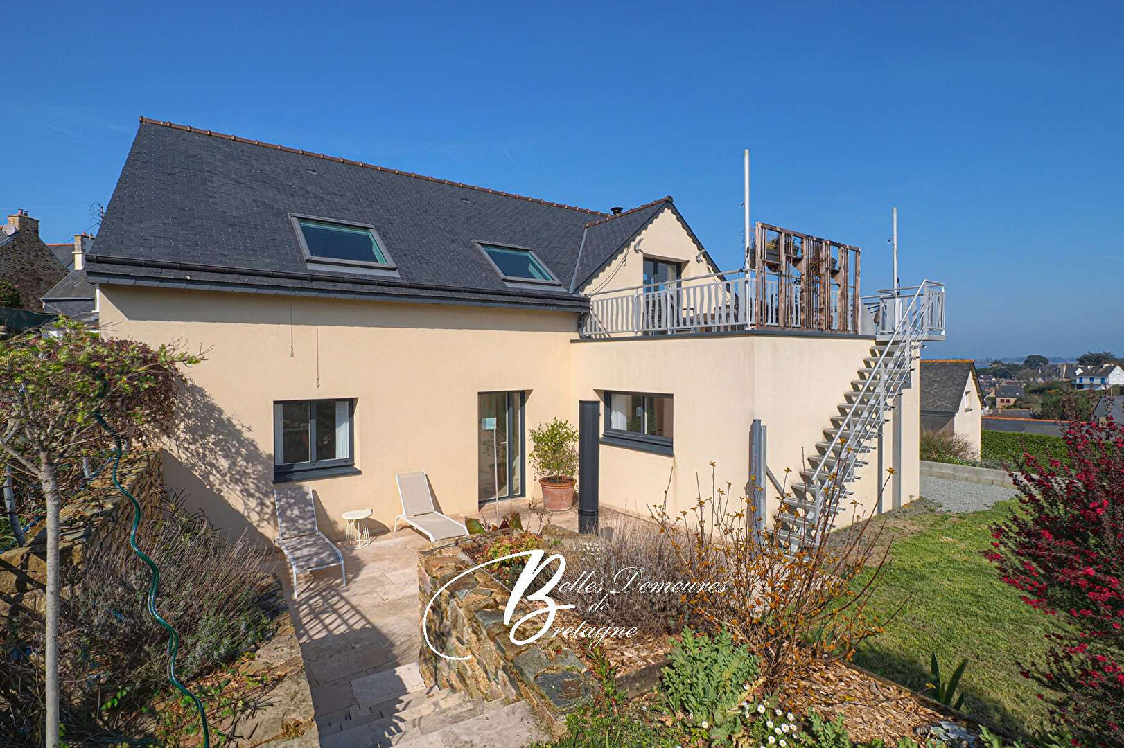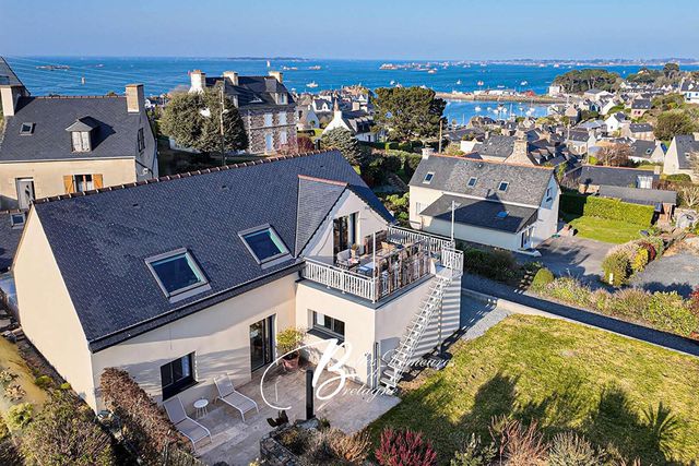 Face à l’archipel de Bréhat, la maison de 155 m² bénéficie d’un emplacement recherché et d’une vue sur le littoral. À l’étage, l’espace de vie principal agrémenté d'un poêle à bois s’ouvre largement sur le paysage marin : un séjour-salon baigné de clarté prolongé par une terrasse suspendue, une cuisine ouverte qui accompagne naturellement les moments partagés, une arrière‑cuisine fonctionnelle, ainsi qu’un wc avec lave‑mains. Ici, la mer devient un décor permanent, changeant au rythme des marées.