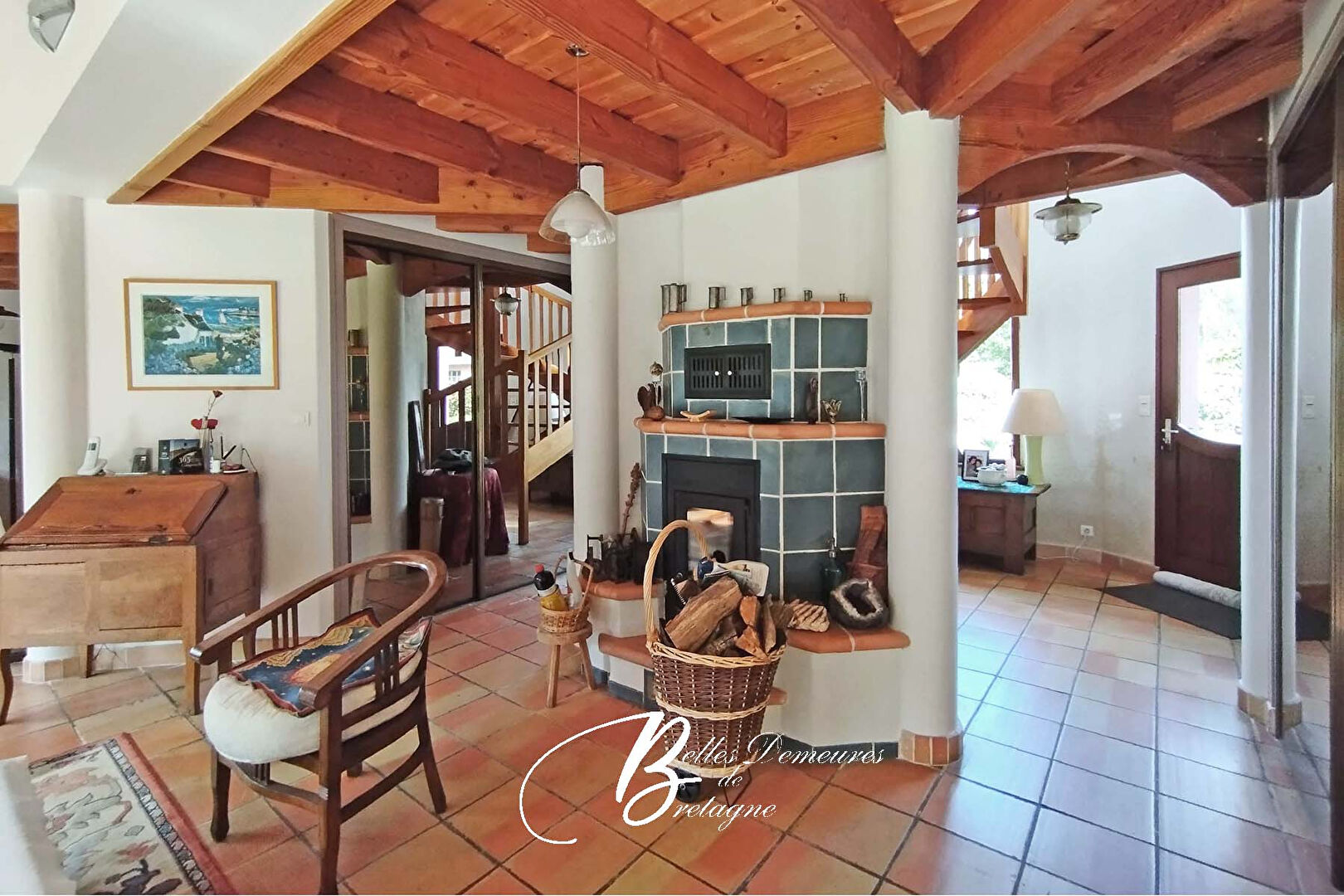 On est d'emblée charmé par l'architecture extérieure et intérieure de cette jolie maison. L'entrée donne le ton avec son plafond cathédrale, sa charpente en bois apparente et son bel escalier desservant l'étage.