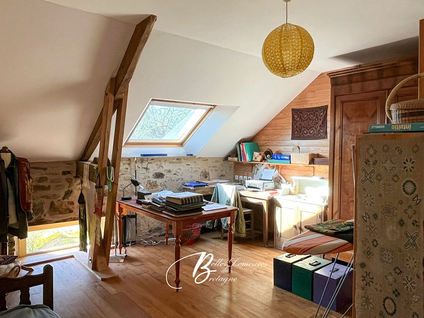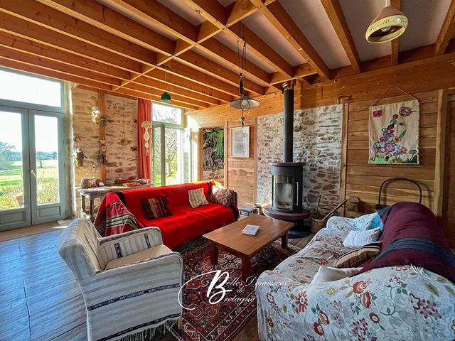 Descriptif : La maison offre au rez-de-chaussée : entrée spacieuse ouvrant d'un côté sur un vaste séjour avec cuisine et poêle à bois et de l'autre côté : chambre, salle de bains, toilettes. Un atelier avec cellier et arrière-cuisine complète ce niveau. A l'étage : un beau séjour en mezzanine, deux chambres, une salle d'eau avec des toilettes. Dans le prolongement : un grand grenier.