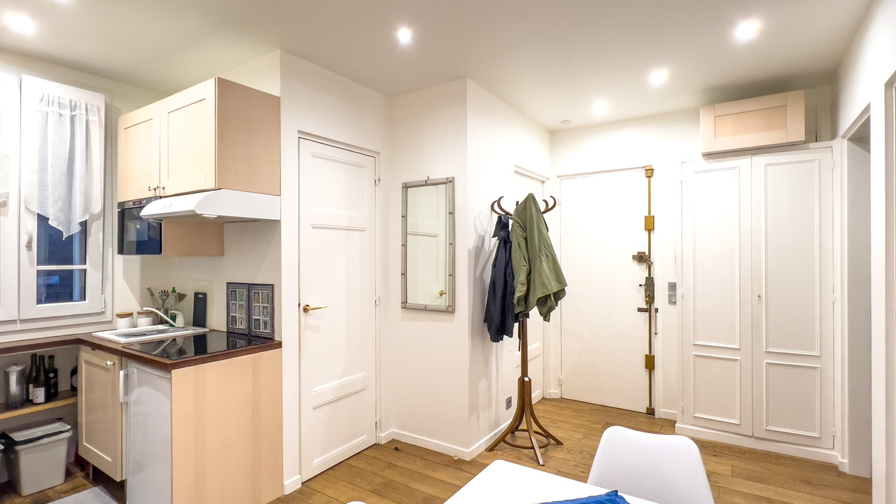 A19516DPE75 - Paris 75017 - 1 bedroom - 46,25m2 - See floor plan and 360 virtual tours - Ideally located between the Martin Luther King Park and the covered market, maintaining the village spirit, attractive double exposure apartment, on the 1st floor of a small building dating from 1953, well maintained and cared for with lift. Remodeled in 2012 with quality materials, keeping mouldings and parquet flooring, including an optimization of the lighting to bring a warm atmosphere, this 45,85m2 carrez property, between a pedestrian impasse and a courtyard, offers a rare haven of peace just a few steps from the shops. Ready to move in, this property comprises a living room with equipped kitchenette, a dinning room, a bedroom, a bathroom and an independent toilet. A useful 3.50m2 cellar completes this property in the heart of this dynamic neighbourhood with its traditional and trendy population, which has retained its charm of yesteryear with its cobbled streets and its cafés, brunch, bistro and gastro.