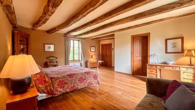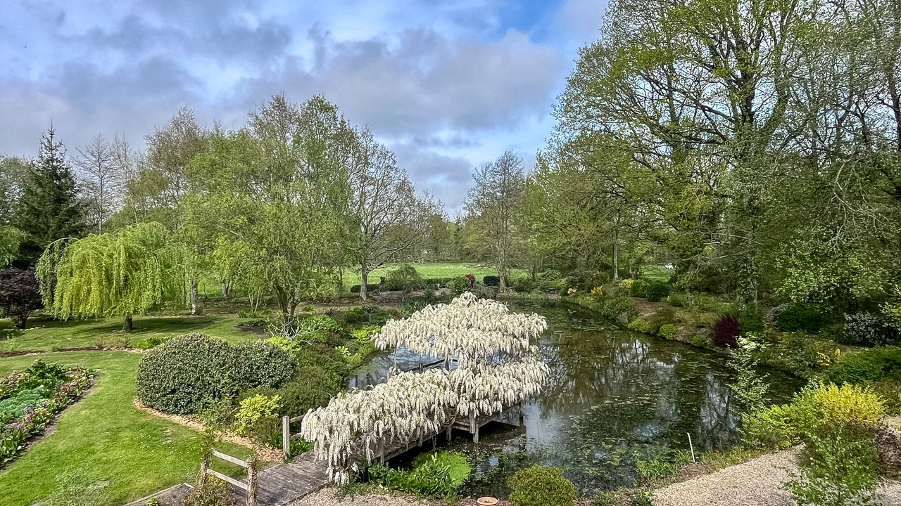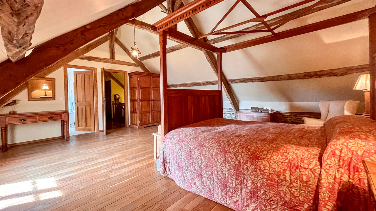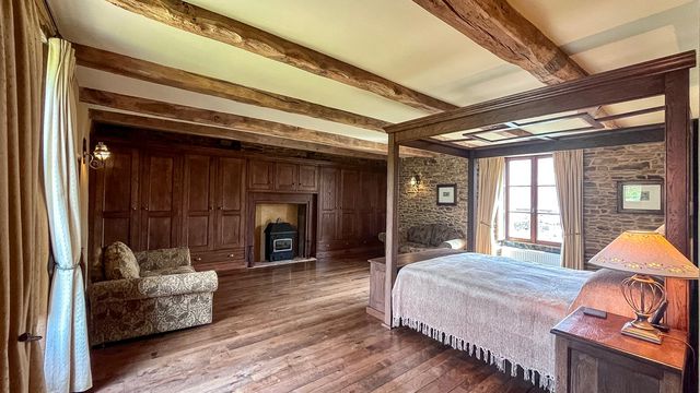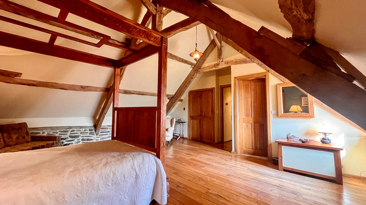 Elegant Maison de Maître in Trans-la-Forêt, Brittany, set in 7,500 m² of landscaped gardens with private pond, terraces, and peaceful outdoor spaces. The main house offers 270 m² with four ensuite bedrooms, while an independent one-bedroom gîte (72 m²) sits nearby. Original stone outbuildings have planning permission for three additional gîtes, partly started — perfect for holiday rentals, retreats, workshops, or boutique hospitality. Renovated to a high standard with bespoke oak joinery, fireplaces, and underfloor heating, blending period charm with modern comfort.