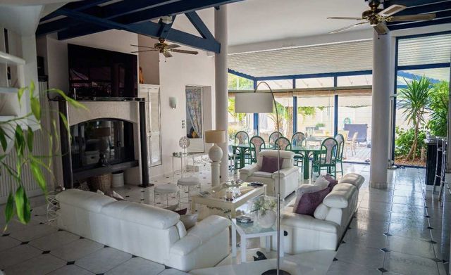 The main living area features a bright, cathedral-ceilinged living room with a closed fireplace, opening onto a conservatory and a 350 m² terrace.