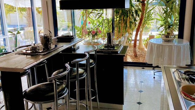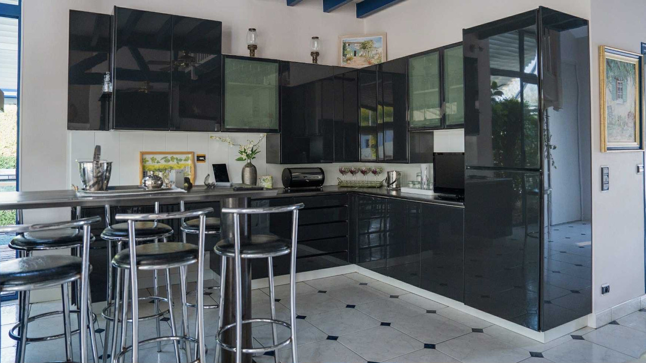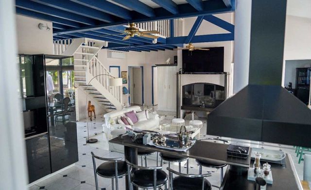 The modern, fully equipped main kitchen opens onto the living room, while a second, separate kitchen completes the layout.