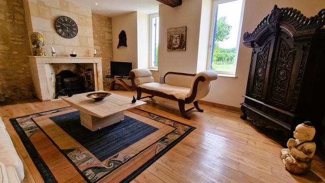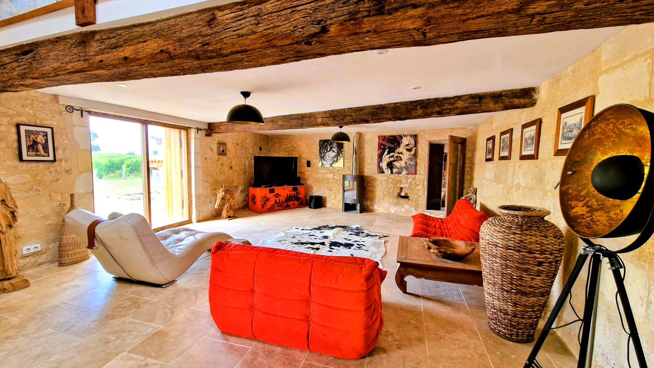 A41547SAG33 - Beautifully renovated stone property in the heart of the Lussac vineyards, consisting of three adjoining houses (192 m², 176 m² and 124 m²), ideal for a large family, multigenerational living or a gîte/holiday rental project. The ensemble offers a total of 492 m² of living space and combines historical charm with modern comfort.