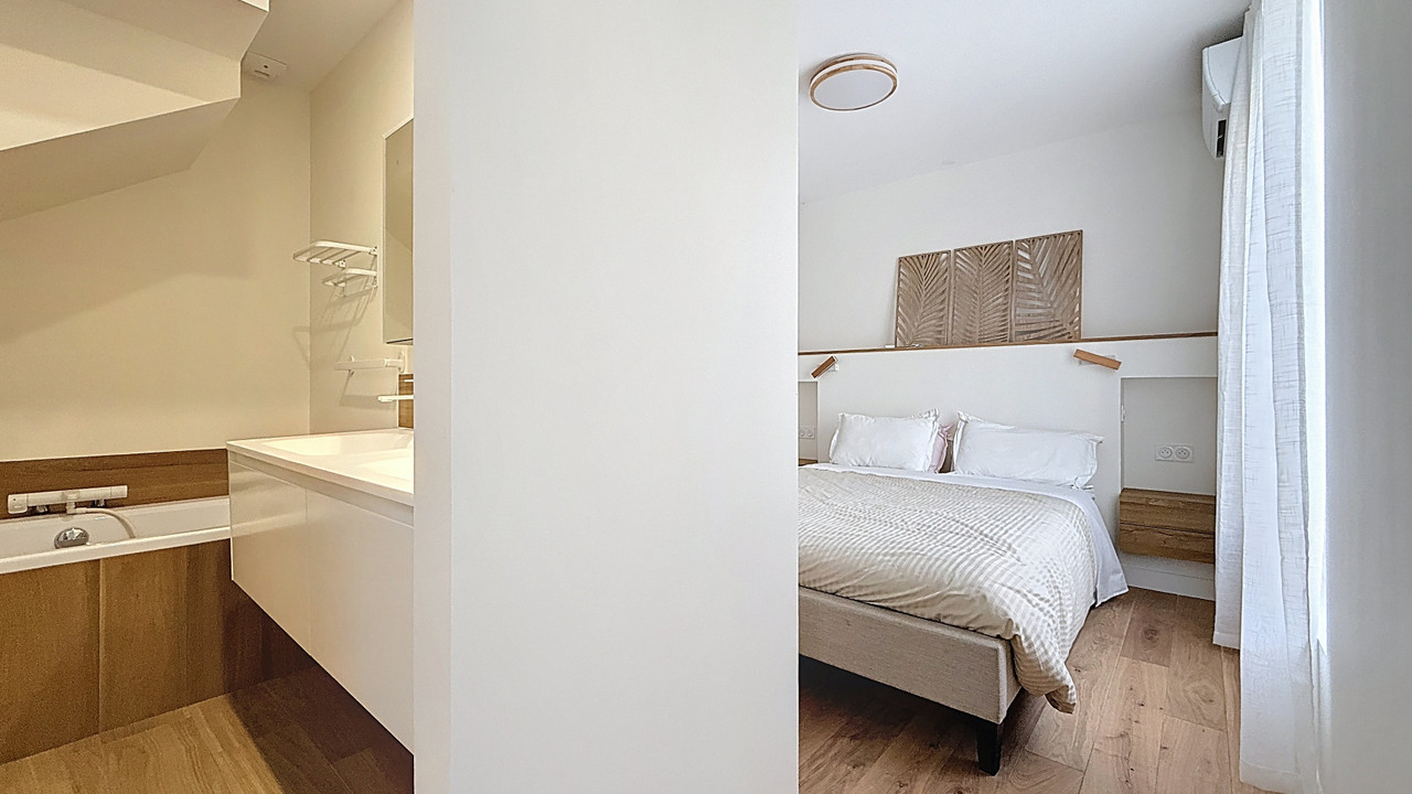 Organised over three levels around a paved courtyard, the house benefits from bright volumes and a well-balanced layout. The ground floor features a generous living space opening onto the courtyard, a fitted and equipped kitchen, as well as a study or guest bedroom with its own shower room.
