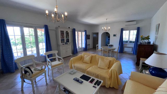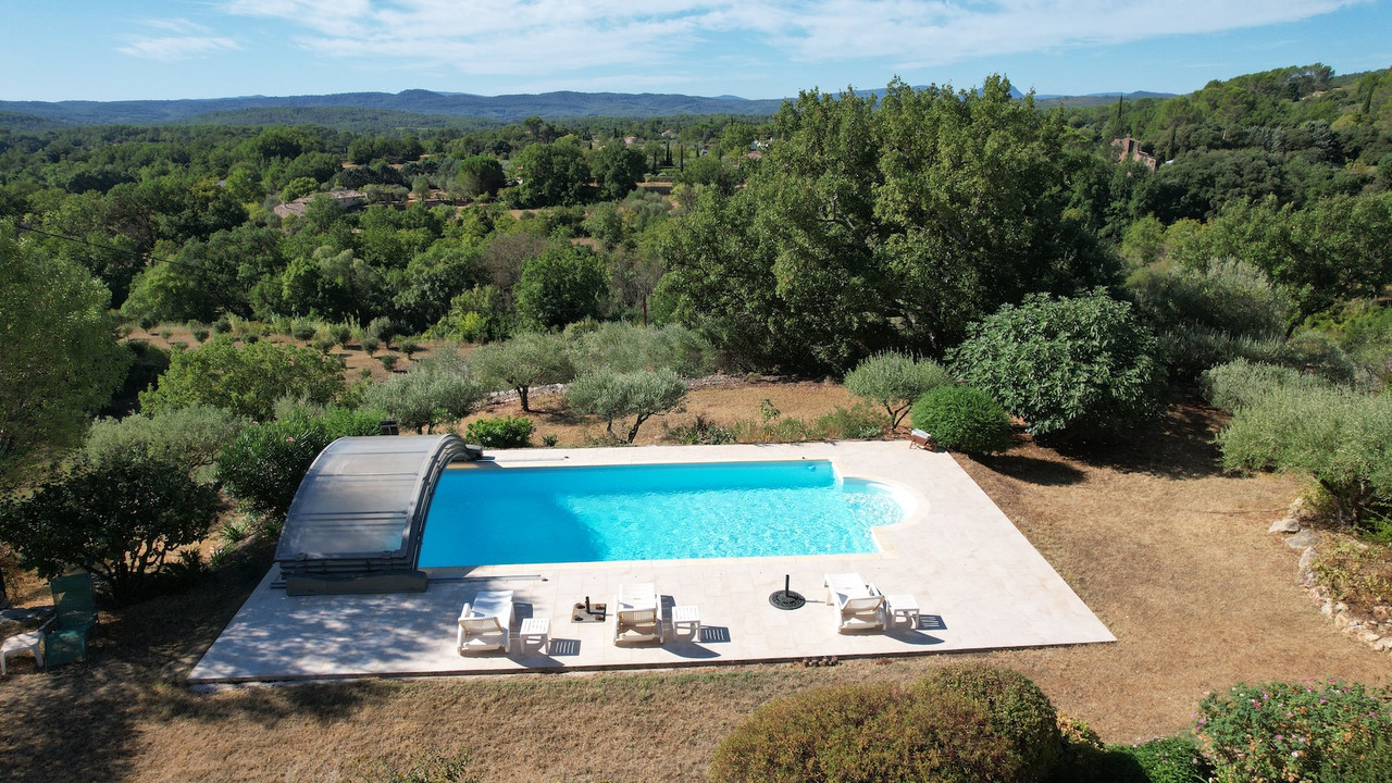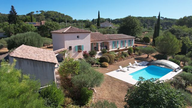 A40346GWI83 - Fabulous villa in Cotignac, Provence. This gorgeous provençal property is in a quiet location and not overlooked, near the village and all amenities, this house has 4,240 m² of land, planted with 80 olive trees and various Mediterranean plants. Enjoying complete privacy and tranquility, it offers exceptional panoramic views of the surrounding countryside. The garden features a lovely swimming pool.There is a large garage of 27m² and covered parking. On the ground floor: entrance hall, guest toilet, a large living/dining room of 45m² with a fireplace. This bright room opens onto a shaded south-facing terrace overlooking the pool and the fabulous views. A spacious, fully equipped kitchen with a dining area, a pantry/utility room, a master suite with bathroom and toilet, three additional bedrooms, a dressing room, a shower room and a separate toilet. The attic (37.8 m²) could be converted into additional living space. Large garage and carport. Situated in a sought-after area.
