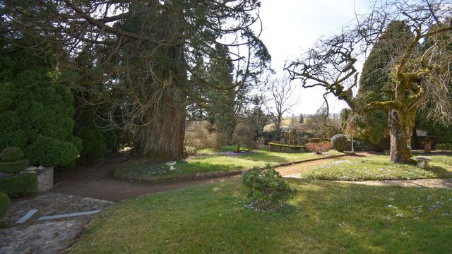 Grand manor house surrounded by meadows and woodland, with a separate outbuilding housing an indoor