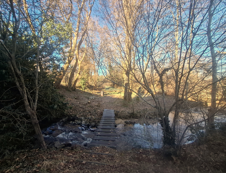 Wooden shed, greenhouse, vegetable garden, mature trees, woodland, and river running through the property.