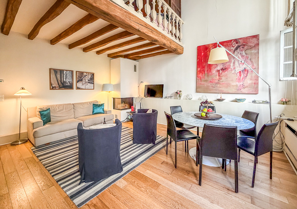 A44023CCH75 - Nestled in the heart of the highly sought-after Île Saint-Louis, this charming approximately 77 m² (830 sq ft) duplex apartment offers a rare blend of historic character and flexible living. Located in a beautiful 18th-century building, the property features exposed wooden beams, generous volumes, and large windows opening onto a peaceful, sun-filled courtyard.
