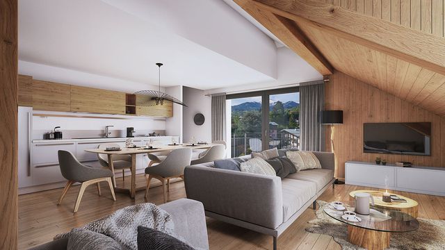 A19461MAA74 - A great opportunity to invest in a spacious 3 bedroom apartment in a new development in the heart of St Gervais. Upon entering the apartment you'll be greeted by an entrance hall opening out into the large open plan kitchen, living and dining area. This generous space offers the possibility to sleep an additional 2 guests on the pull out bed and features a balcony offering stunning mountain views. There is a shared bathroom and WC and three double bedrooms, 2 of which have private shower rooms. The apartment comes fully furnished and ready to go, all you need are your skis!