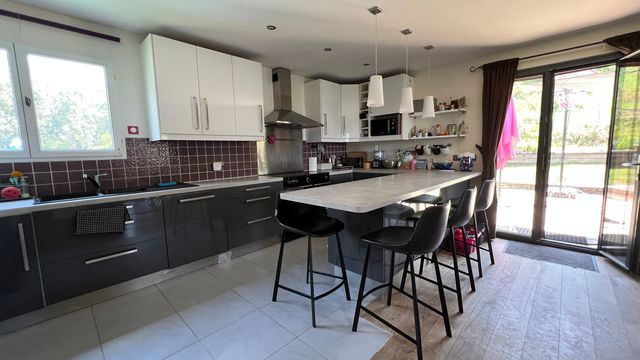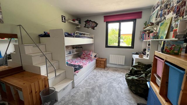 The heart of the home is an expansive open-plan kitchen and dining area, warmed by a cozy log fire—perfect for entertaining and family gatherings. You'll find plenty of space for everyone, including a dedicated office for remote work and a separate TV playroom for the kids.