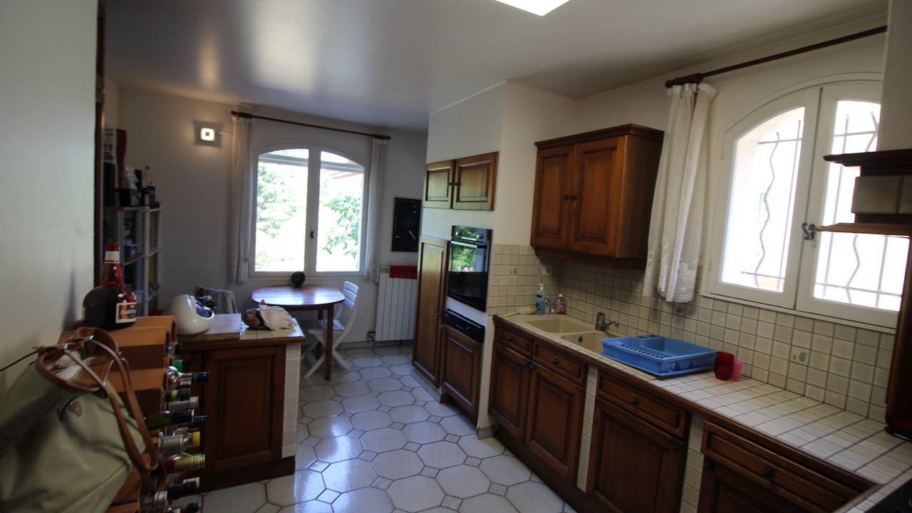 South exposition the house is lignt. The main house : entrance, large living room / dining room with chimney, shaded terrace on the south, spacious independant furnished kitchen, storage room / laundry, 2 bedrooms with cupboards, dressing room, bathroom, toilet.