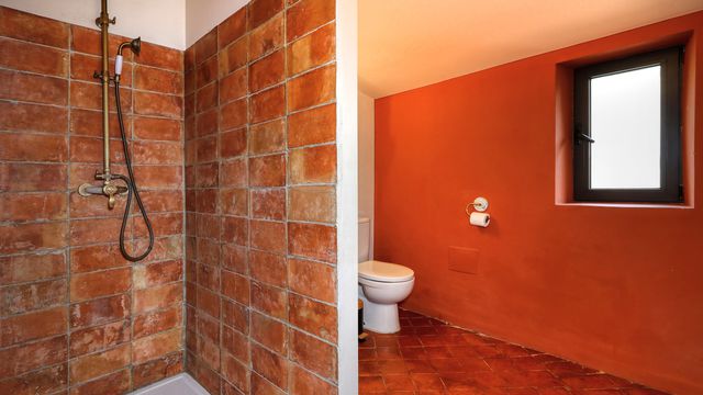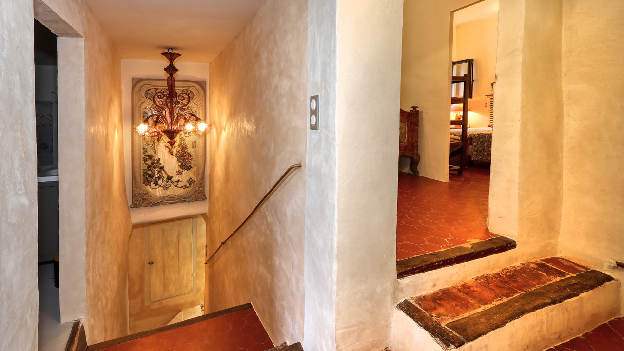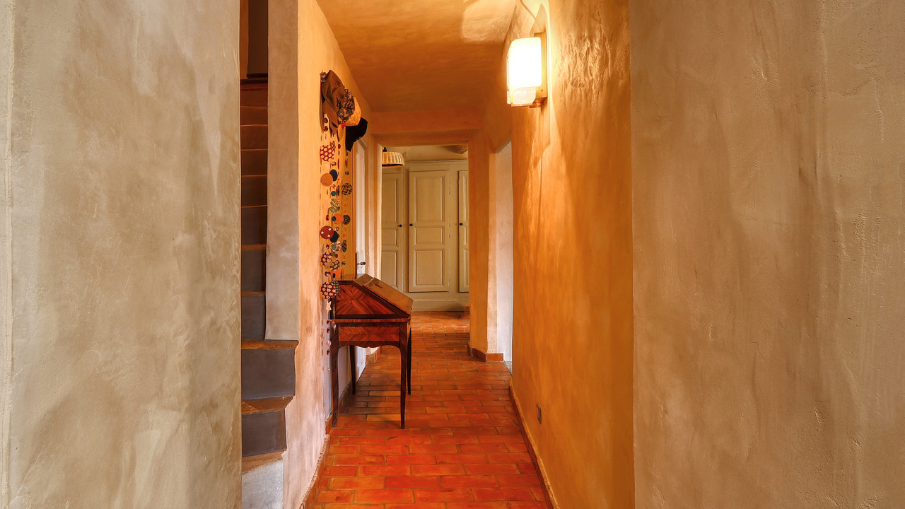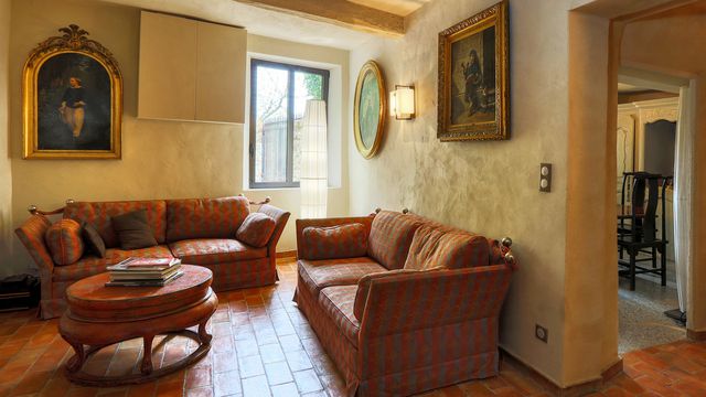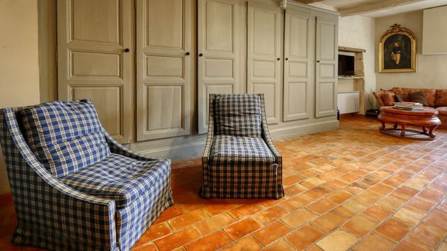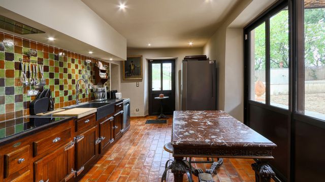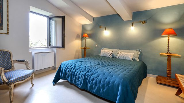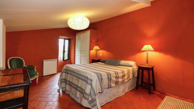It contains warm, inviting spaces where antique terracotta tiles, lime plaster, and traditional French ceilings blend harmoniously. The ground floor features two living rooms: one cozy with a wood-burning stove, the other with stone walls and a bay window to the garden and pool. On this floor you'll find also an en-suite bedroom. The kitchen with baywindows windows overlooking the terrace, creates a bright and welcoming living area.