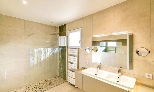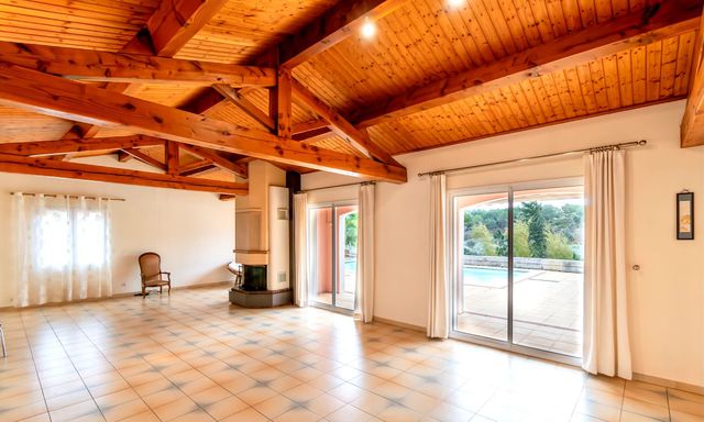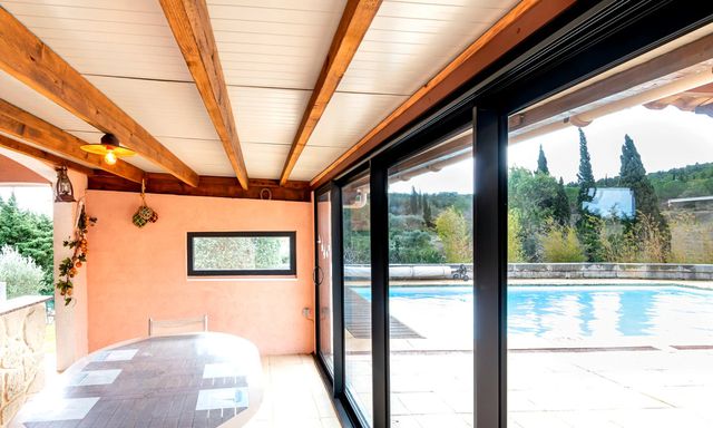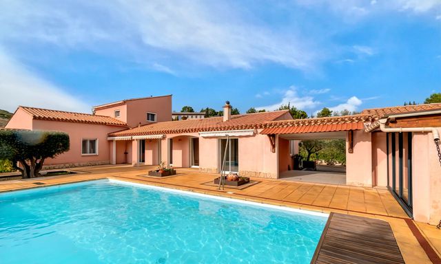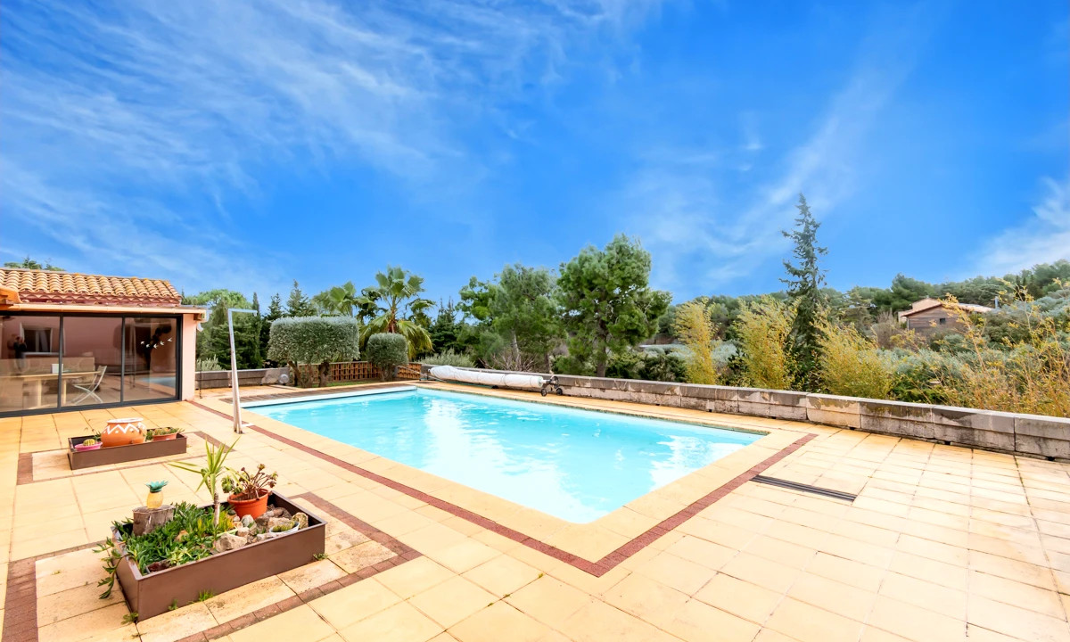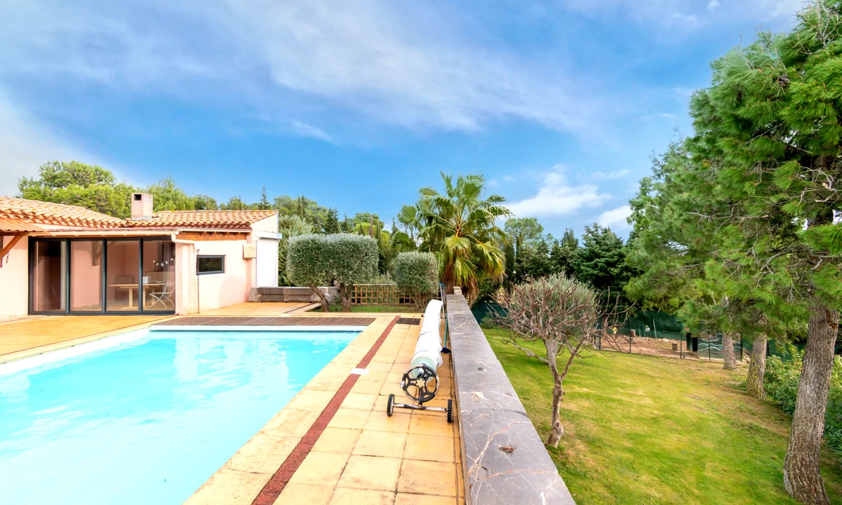 A42173CYV11 - Detached villa in a quiet residential area of Narbonne, just 5 minutes from the city centre. Built in 1992, the property offers flexible accommodation, multiple entrances, a large south-facing terrace of approx. 180 m² with open views, and a 10 x 5 m swimming pool with electric safety cover. Fully enclosed garden, summer kitchen, wine cellar, laundry room and carport for three cars. Four bedrooms, three already benefiting from en-suite bathrooms, with the possibility to create a fourth en-suite bedroom. Energy-efficient features include solar panels, thermodynamic water heater and borehole. Ideal family home close to town and coast.