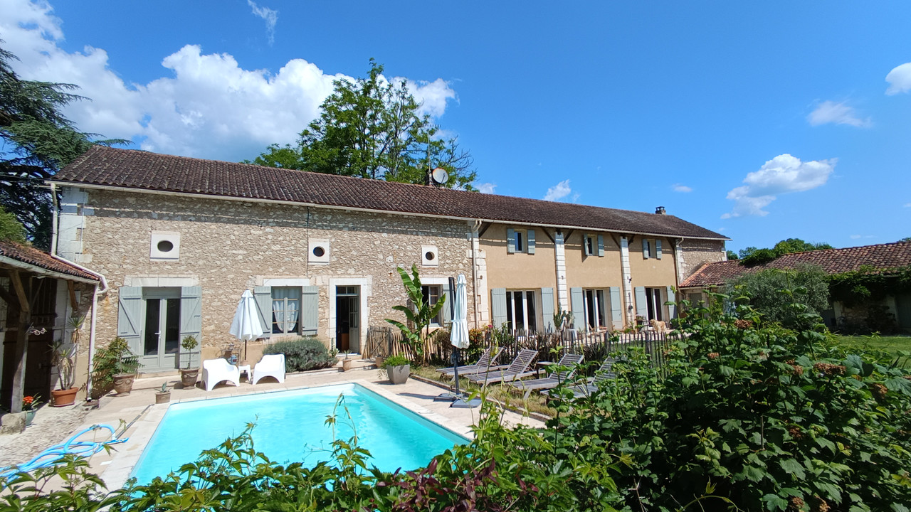 Stone house with gîte and château outbuildings with garden and swimming pool near Périgueux.