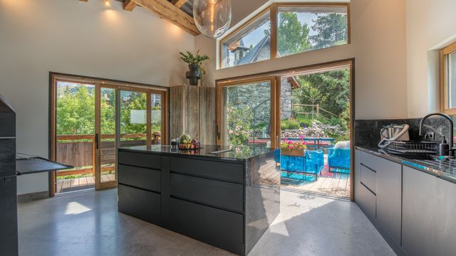 The top floor has an open-plan cathedral ceiling living area, retractable corner glass doors, fireplace, panoramic ski and mountain views, spectacular terrace, and designer kitchen with indoor barbecue