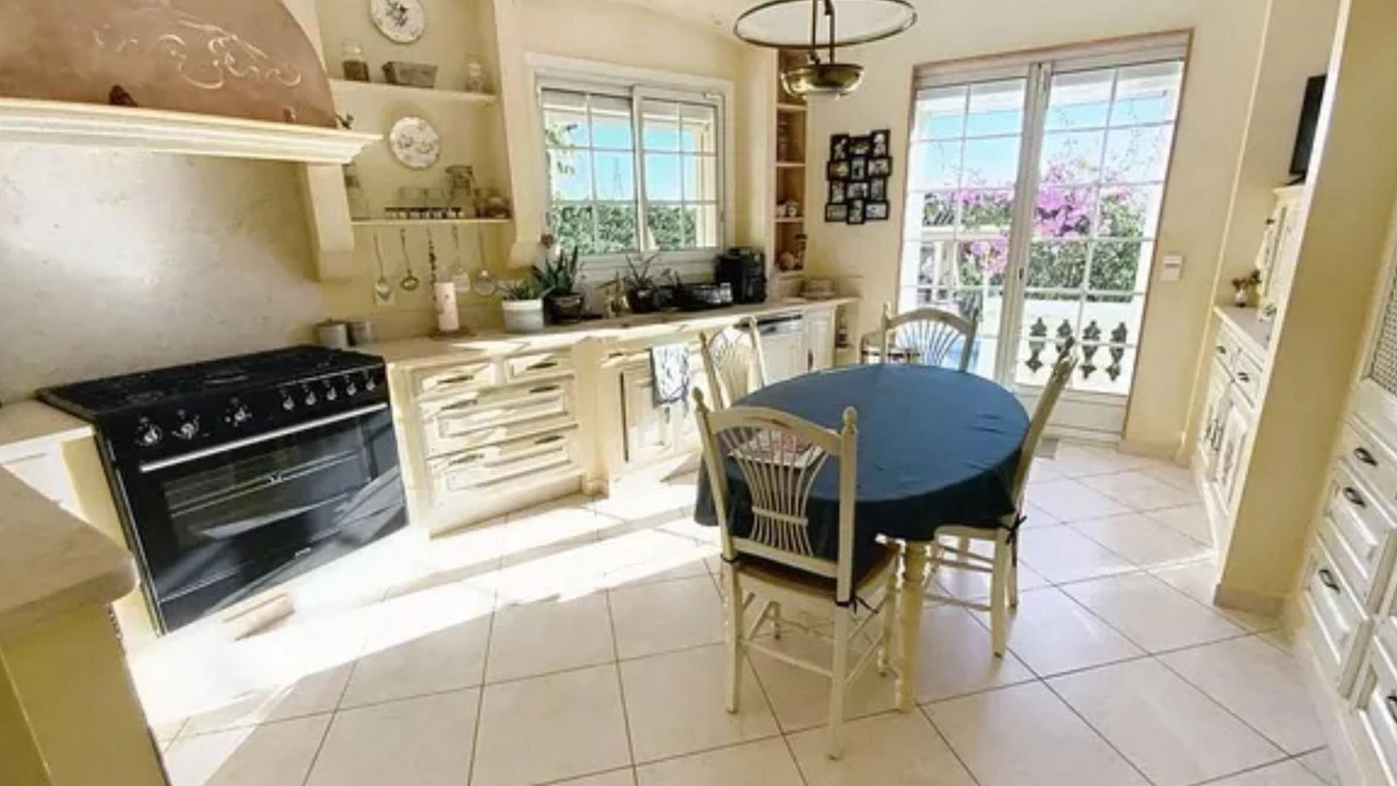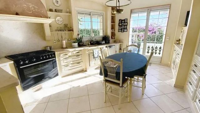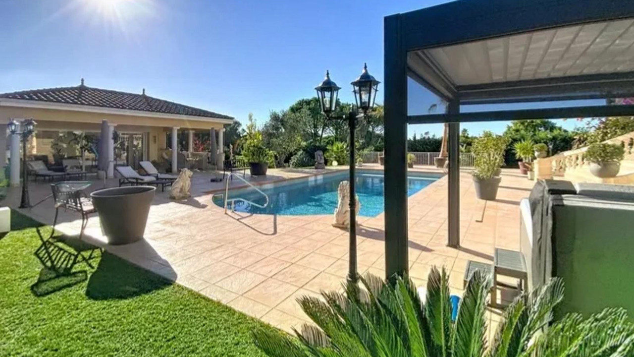 The exterior boasts a heated 12x6 pool with safety cover, spa with bioclimatic pergola, enclosed air-conditioned summer kitchen with bar and barbecue, pétanque court, and an independent 80 m² space.A vast 200 m² garage includes a utility room, wine cellar, and workshop.