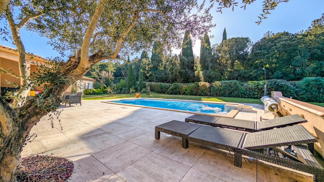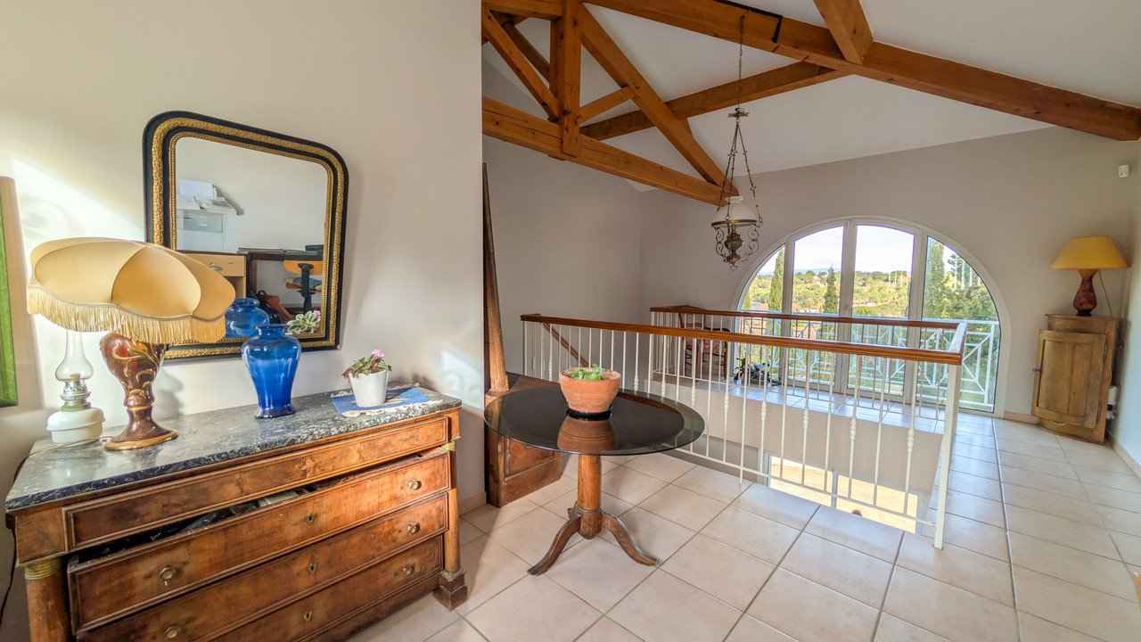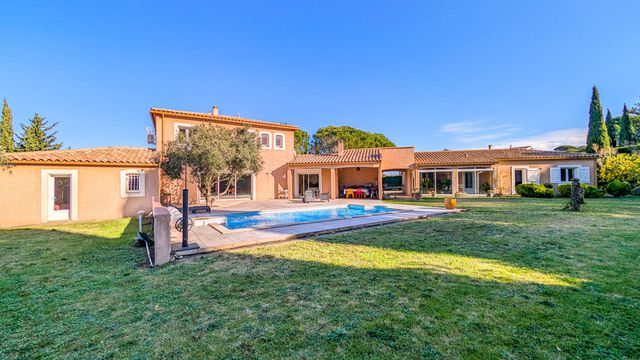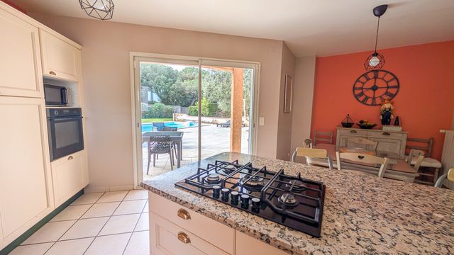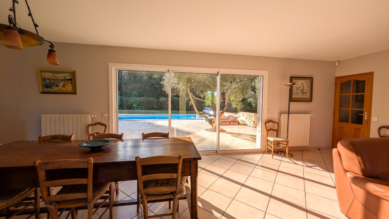 The main house (169 m²) features a bright, open-plan living area that flows seamlessly onto the terrace, swimming pool, and surrounding greenery, highlighted by a large bay window in the dining area. Kitchen with adjoining pantry, 4 bedrooms, 2 bathrooms (including 2 bedrooms and 1 bathroom upstairs) and a large landing office that can be converted into an additional bedroom. Air conditioning installed in 2025.