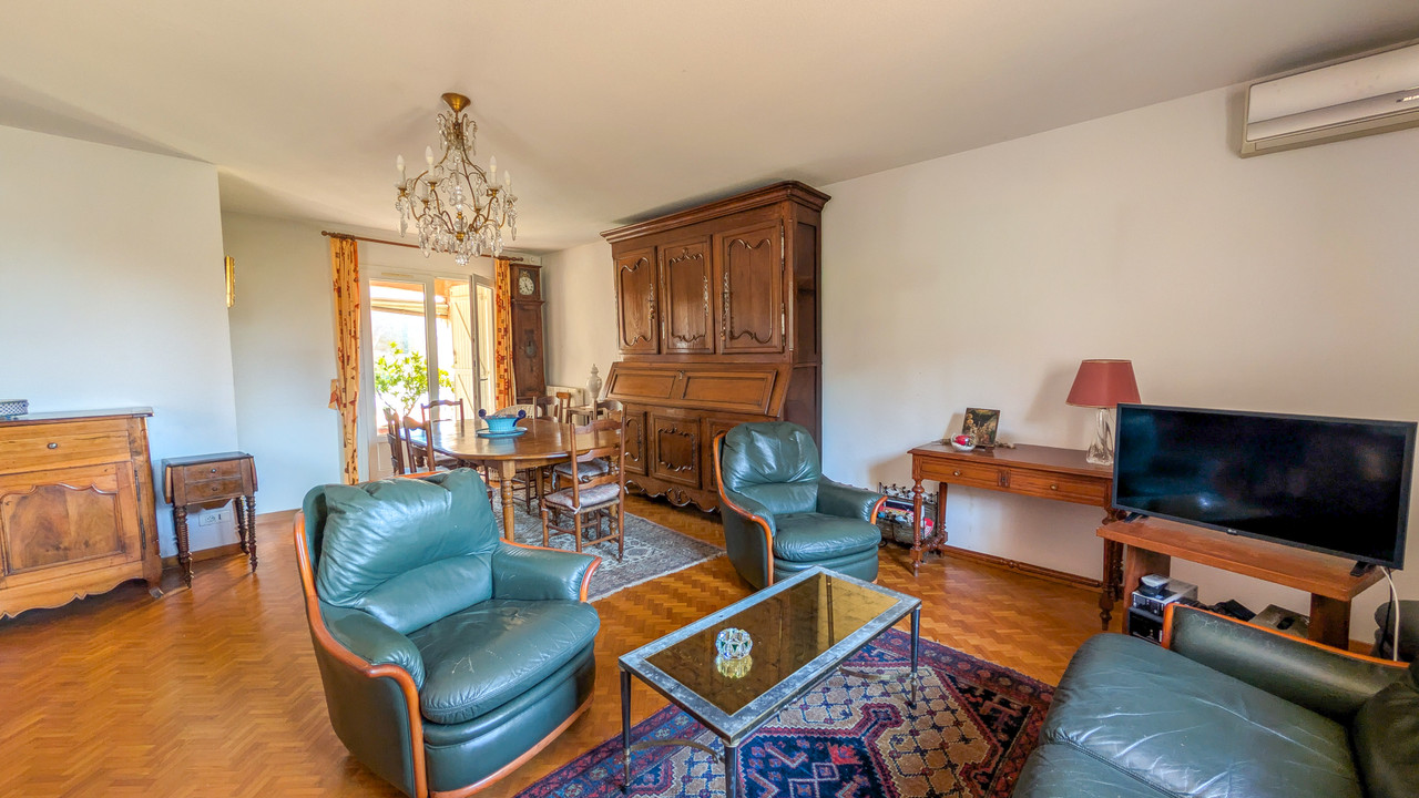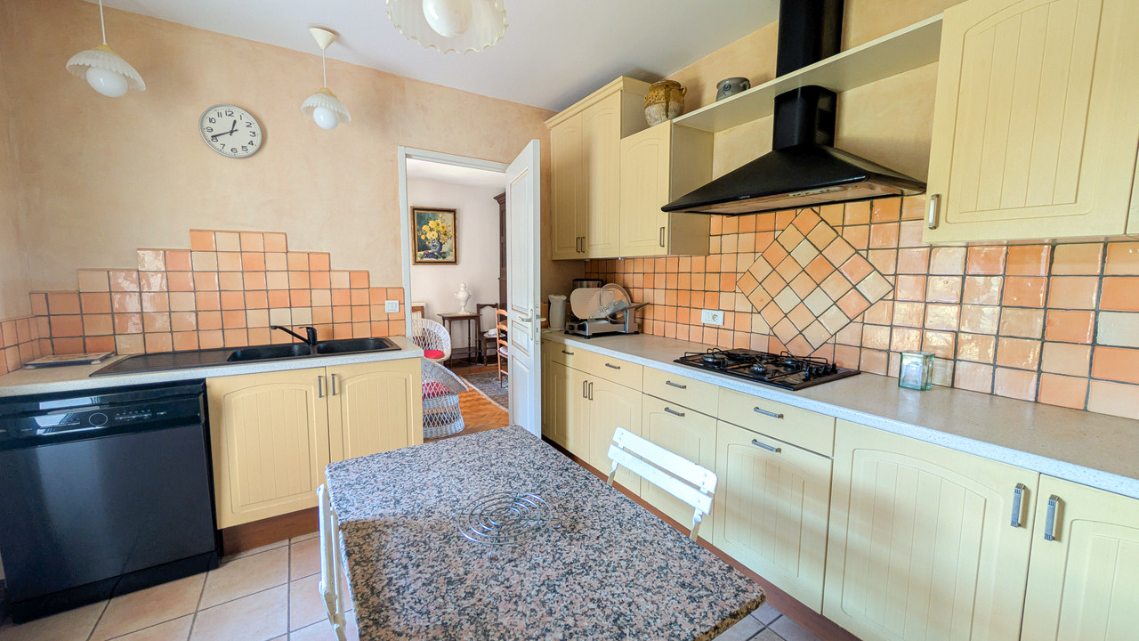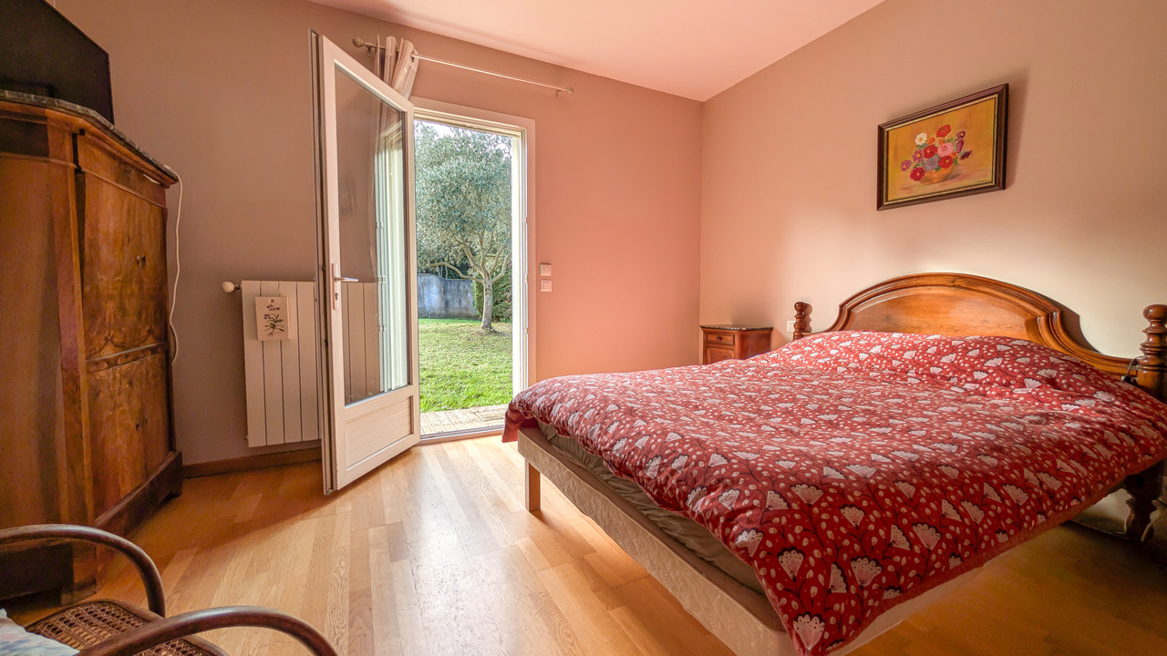 The single-story second house (100 m²) with beautiful solid wood floors and an air-conditioned living room opens onto a veranda, kitchen with utility room, 2 bedrooms, a bathroom with WC and a separate WC. Individual meters, perfect for rental