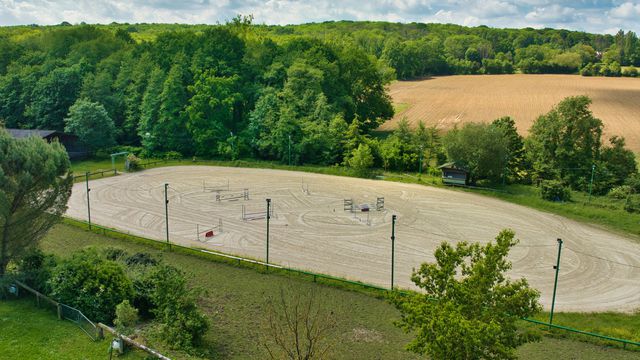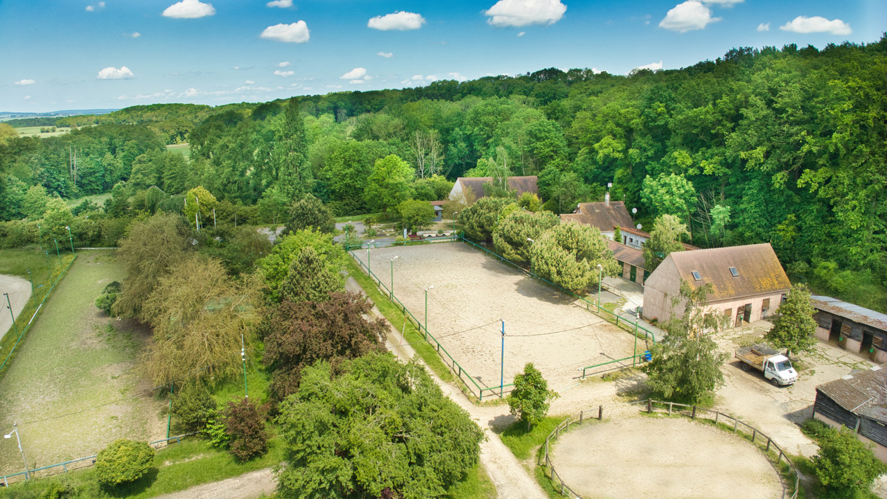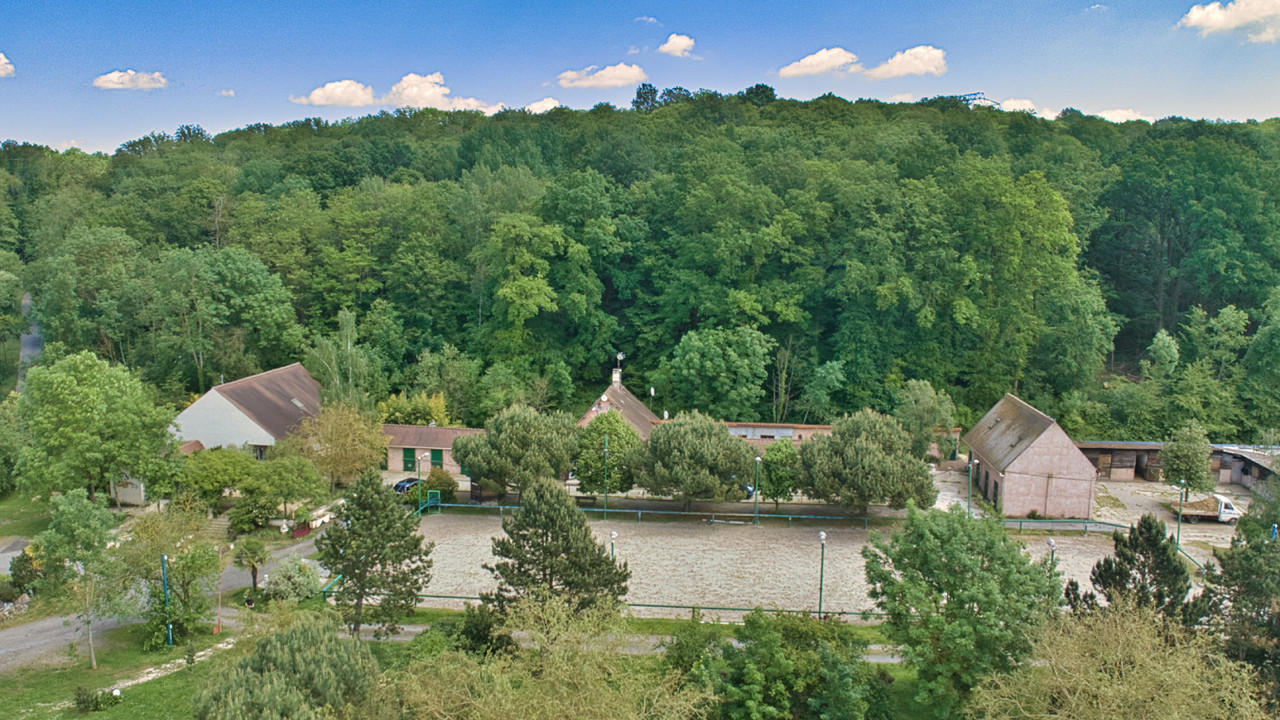 nestling between Bethemont la Foret and Taverny on 3.8 hectares of land on the edge of the Montmorency forest. virtual visit available on request. The facilities include a ground-floor building with a spacious clubhouse featuring a large fireplace, offices and a small kitchen. Upstairs is a F2 flat with a kitchen opening onto the living room, a bedroom and a shower room with toilet. The site also includes several buildings, including 2 studios for staff, boxes, riding arenas, paddocks and a large reception room.
